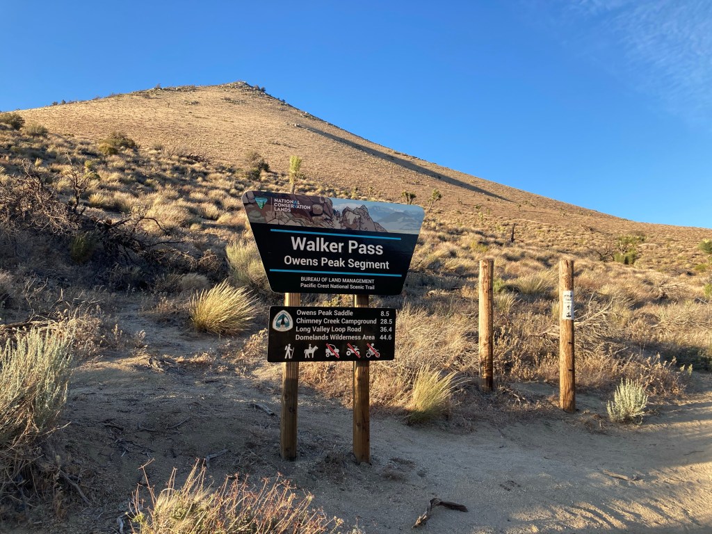 Even though we have enough time, we still want to make sure that we get to Walker just in case Beetle and Andy have any thoughts of leaving earlier without us. So we head out soon after Petra does. It’s all downhill at this point, and the views are beautiful. Across from Walker Pass towers a chain of rocky brown mountains. It’s still very much desert, but the tone is different now.