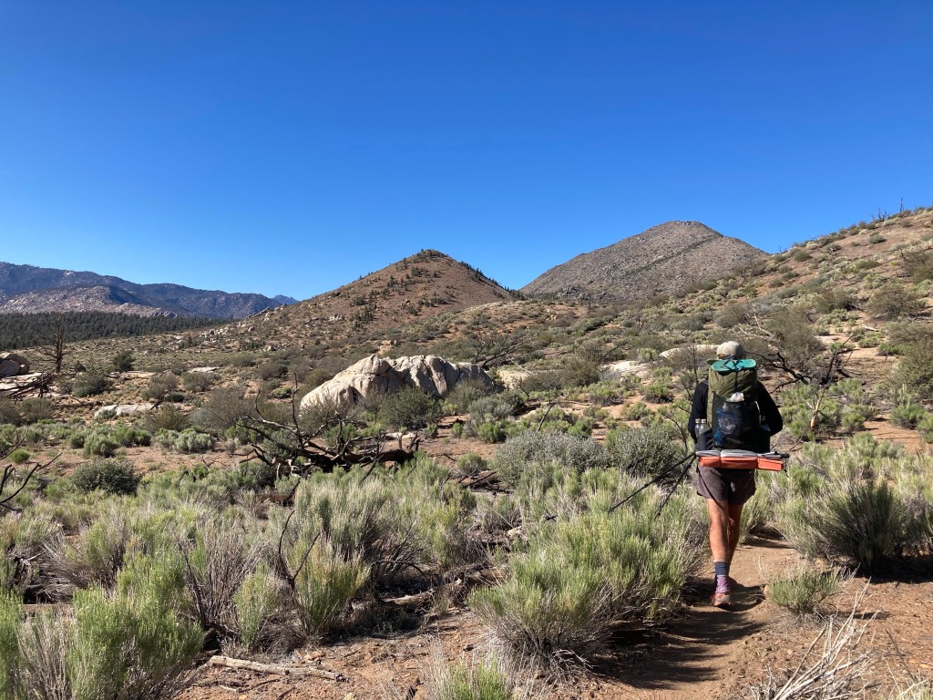 The excitement of seeing the Sierras fuels us for the next few miles. Or at least, it fuels DLT, who continues steadily ahead while I have to sprint uphill for an urgent cathole. Do I talk about food and catholes too much? Sorry, but that’s kind of 50% of hiking. I return to the trail and keep going downwards for over three miles.