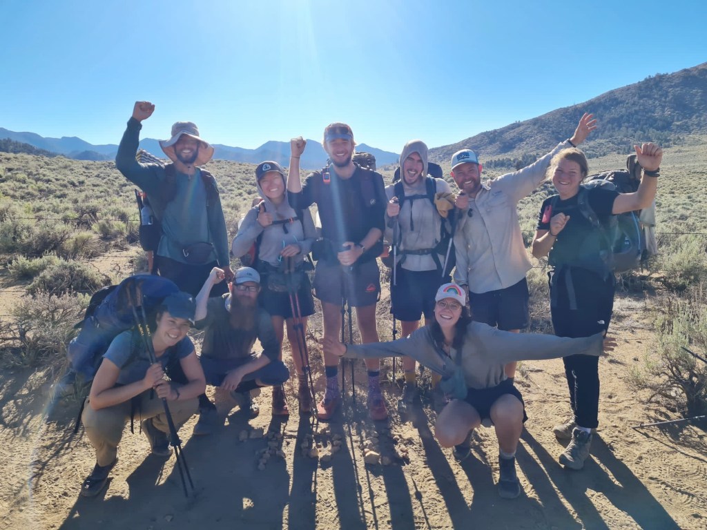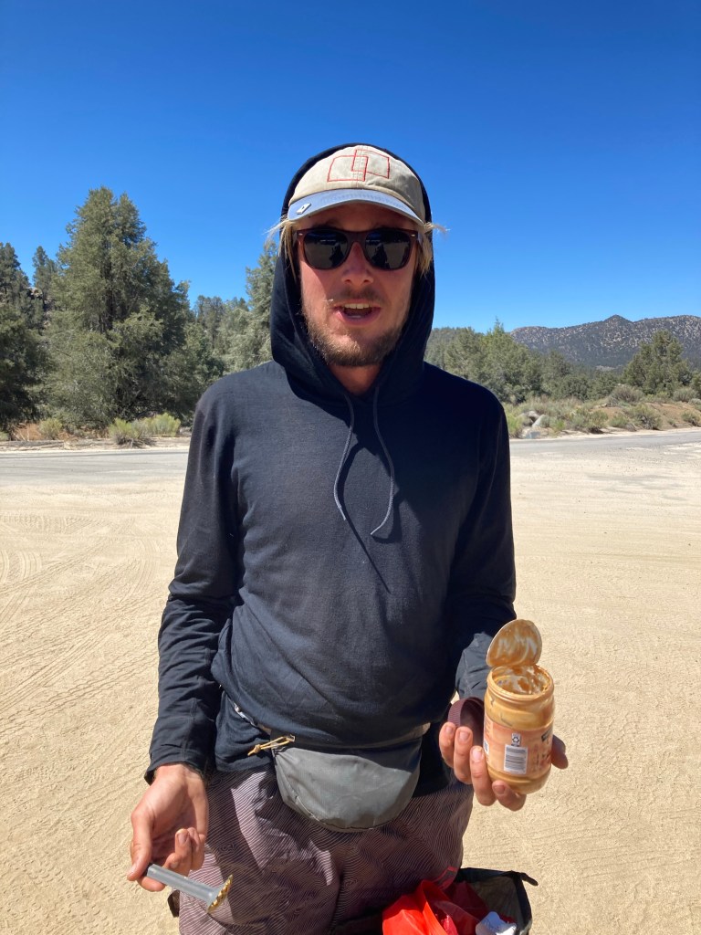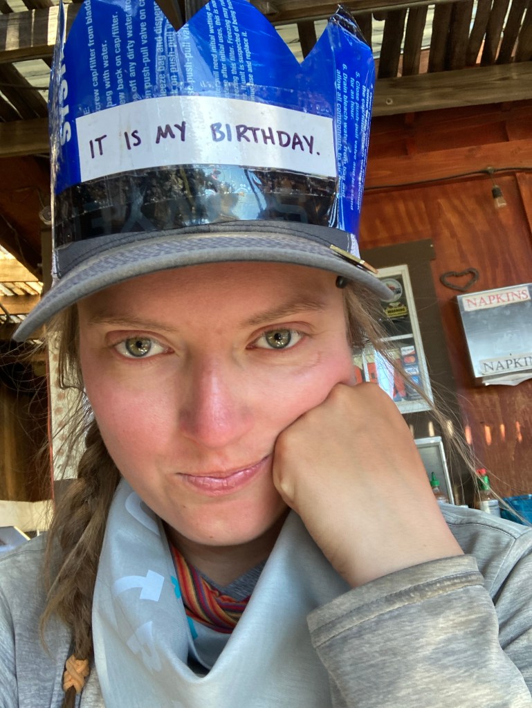 I realized after we resupplied in Ridgecrest that I would be in the Sierras for my birthday on June 8. On the AT, I bought birthday decorations for my tramily, both of whom had birthdays within a week of mine, and I’d wanted to get some kind of hat or crown or badge or something that I could wear on my birthday this year. I forgot to get something there, though, so now that I have two hours until the next shuttle gets here, I decide to get a little crafty and make one. I try to use the boxes, but the cardboard is too thick. Then I have the idea to take all the ditched Sawyer Squeeze bags from the hiker box, cut them up, and tape them together into a crown. Then I cut it so that it has peaks and write on a piece of paper “IT IS MY BIRTHDAY,” all caps, with a period, Dwight Schrute-style. I am extremely pleased with my work. As an added bonus, there’s also some Mardi Gras beads in the box. Heck yeah. Now I’m ready to turn 29 in the mountains.