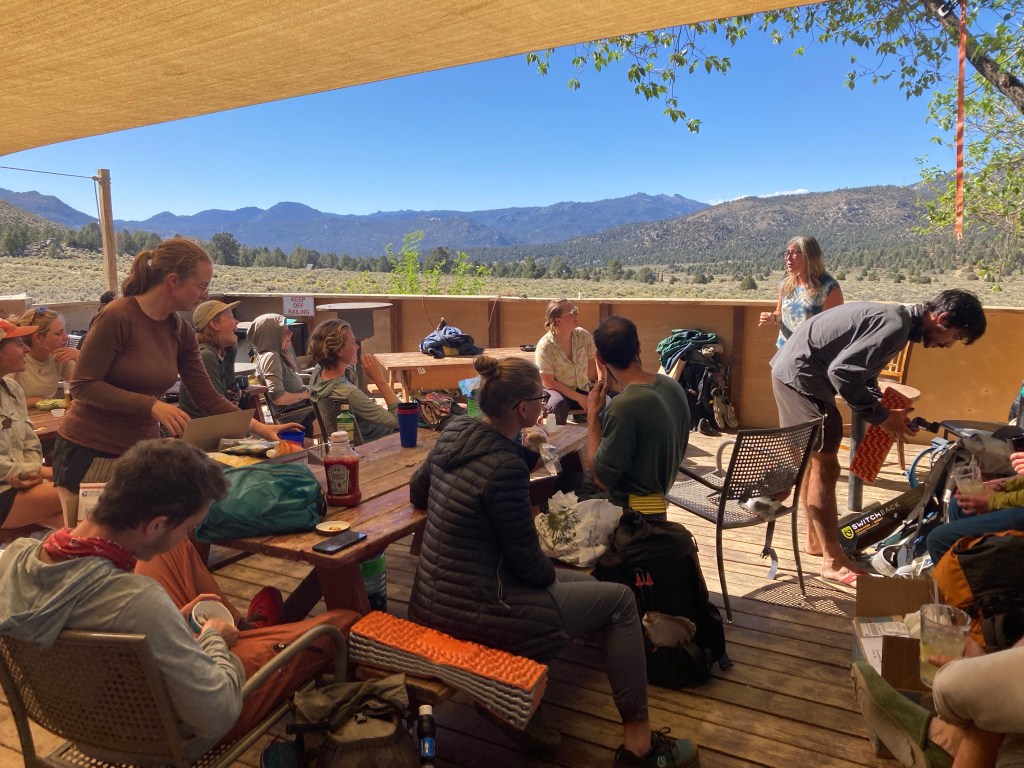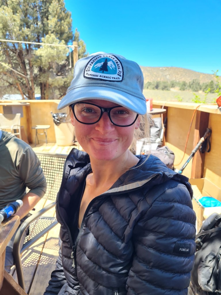 The line at Grumpy’s is equally long, and we have missed breakfast. By the time we get through line, it’s lunch time. I get a double cheeseburger and a beer and then go outside and sit with Petra. She pulled a 30-miler and then a 31-miler to get here yesterday morning, for some reason. She’s excited because she was given a PCT class of 2022 patch by a hiker who makes them, and she sits and sews on the patch while we wait for our lunch.