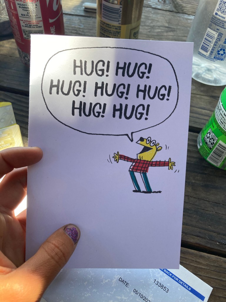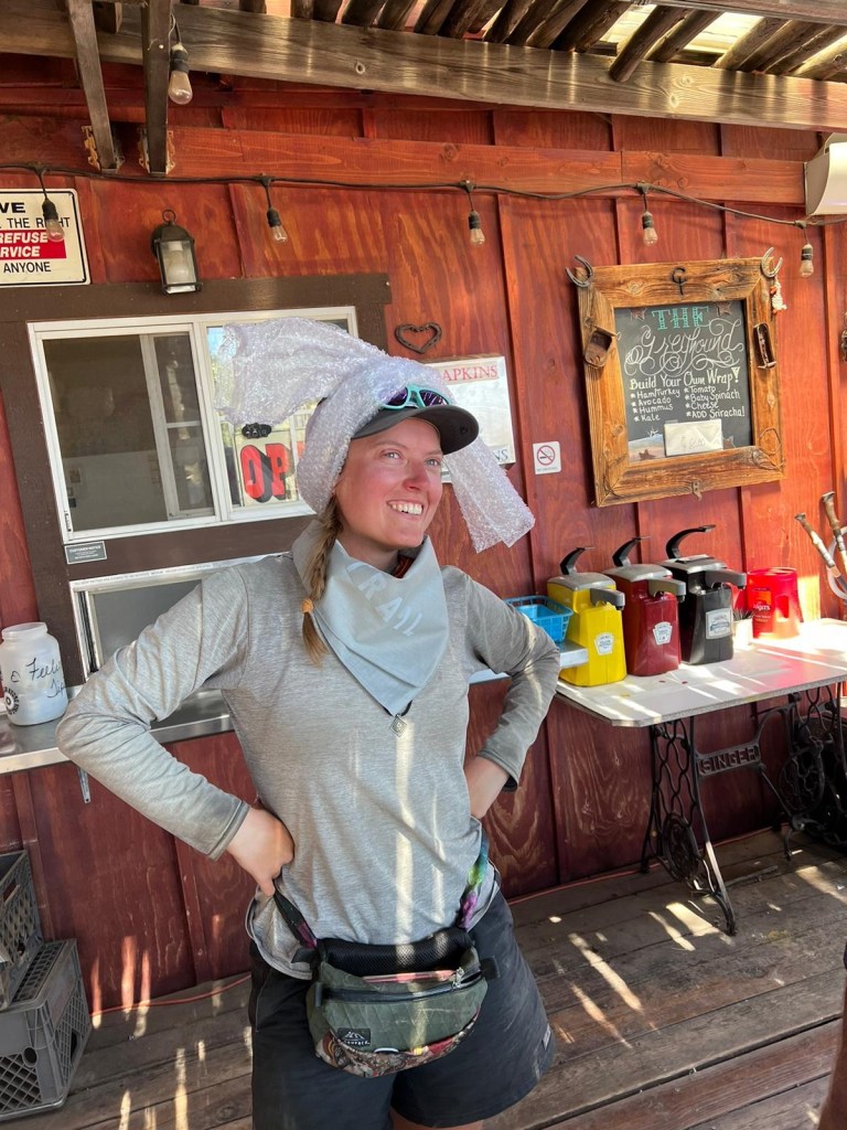 Honestly, the General Store is… not that impressive. I’m surprised how wiped out their stock is. There’s a huge line, and the guy working the register is so over it, he barely talks to anyone as they come up. I get it. They’re understaffed, and there are tons of hikers this year. It would not be the most fun job in the world. But it’s a little surprising considering how legendary this stop is. I buy a Pepsi (because they didn’t have coke), a coffee, and a fruit cup. There’s not really any breakfast being offered, and DLT goes from sad-hungry to cranky-hungry in a matter of minutes. We decide immediately to take the shuttle down the road to Grumpy Bear’s Retreat, the only other lodging-slash-food option in this valley. It takes a long time, though, and DLT saltily eats peanut butter right out of the container while we wait.