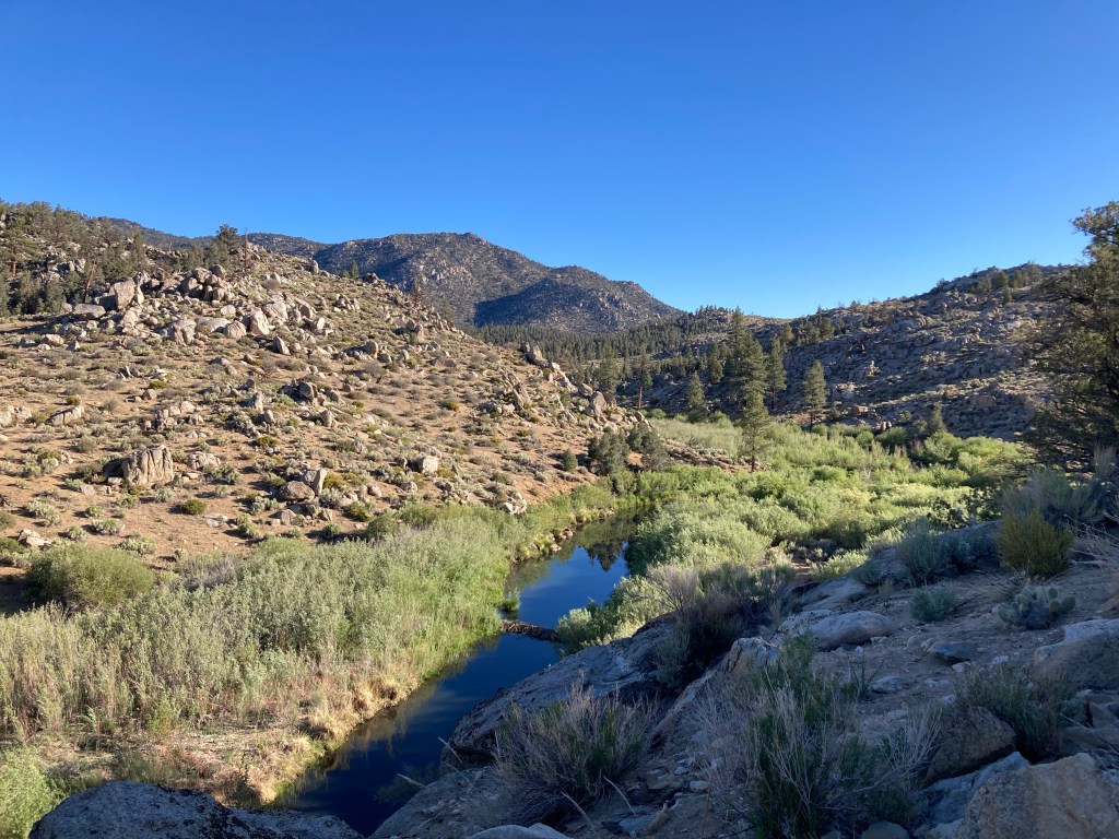 Catless, DLT, and I don’t wake up early. Nothing opens until 9 anyway, so we don’t see the point in rushing to Kennedy Meadows. Instead, we take a long time getting up (me especially, as usual). We eat breakfast (me in my sleeping bag, getting oatmeal all over it like the creature I am), pack up, and say gooodbye to this most beautiful river and campsite: our last in the desert.