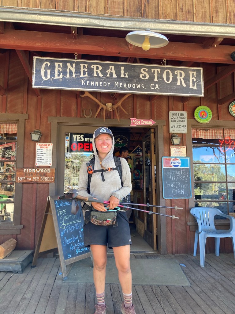 But first, Kennedy. We walk the two more miles to the road crossing, then turn right and walk towards the General Store. DLT is very excited about the tradition of people applauding for hikers as they come into the parking lot, and we are all savoring the thought of breakfast. We take a photo with the green Kennedy Meadows road sign, then before long, we are arriving at the General Store. Sure enough, a wave of clapping and cheering erupts as we walk up. It feels so surreal. We made it out of the desert!