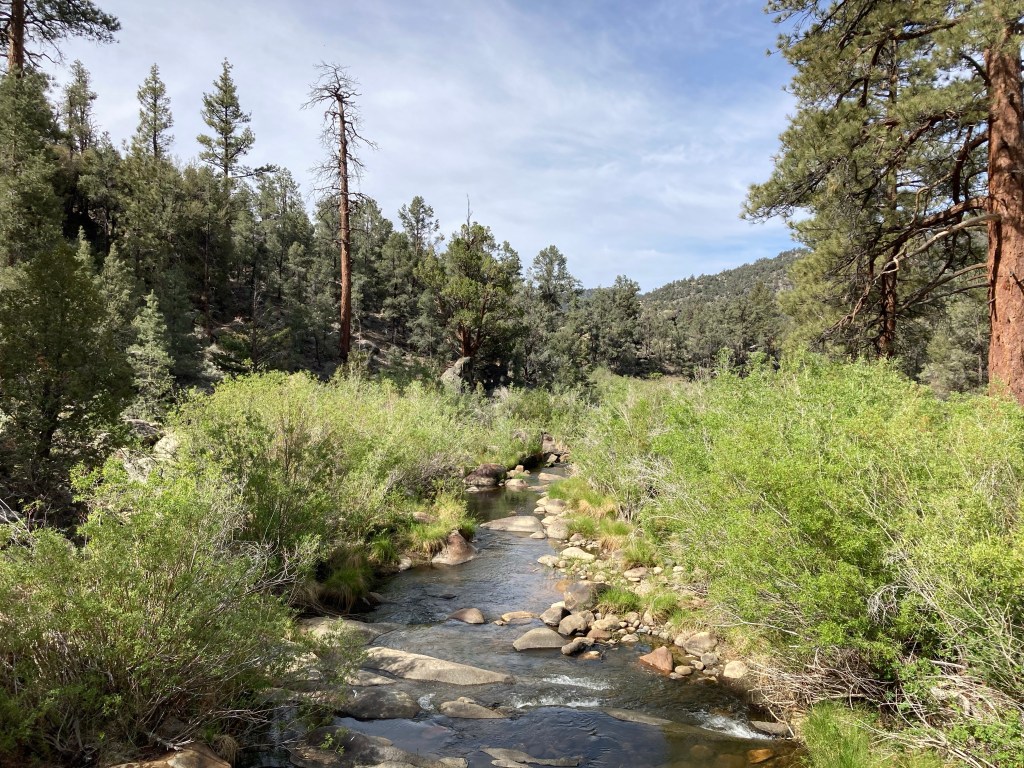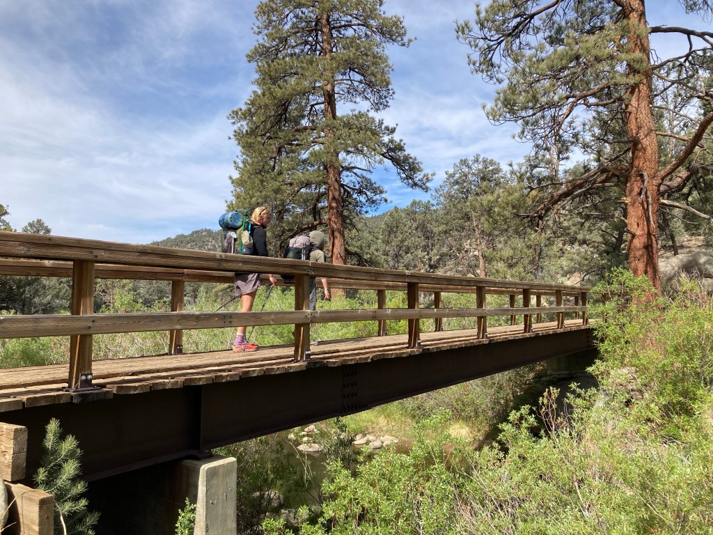 We hike in a conga line for a while, which typically stresses me out, but it’s nice to talk to the Belgians a little more. I walk with Rainbow, who tells me she works with at-risk youth back in Gent and that she’s thinking of making a game for them related to the animals she sees on the PCT. Soon we reach a crossing of the South Fork of the Kern River, where a lovely bridge spans the gurgling water. It’s still so amazing to me that we’re going to be hiking in an area where there’s water everywhere! Goodbye, long carries! The Belgians leave before the thee of us do. We just sit there next to the water eating our bars and taking in the start of a new section.