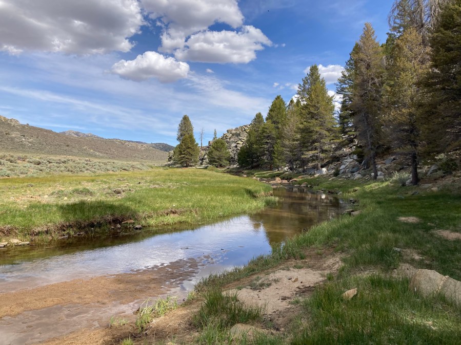 Soon we arrive at the meadow, where we meet up with our trail pals again. It is a beautiful spot. The river slowly wanders through green grass and beneath the bridge, where tons of swallows have made nests. I lay my tyvek down and take a nap in the sun. I absolutely pass out. It’s delightful. When I wake up, most of the people are gone and DLT looks like he’s on the move to get going again. I filter some water and get ready to hike, then two other hikers tell us that they saw a pair of marmots upstream. DLT’s eyes go so wide I think they might pop out. We rush over, and sure enough, there are a couple of marmots on the bank of the creek. We’re really in the mountains now!