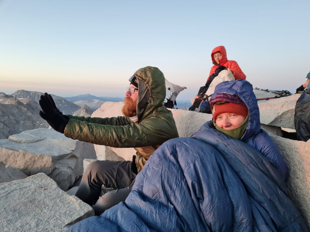 Once the sun is properly up and I’m less miserable, I get people to take photos of me and then I FaceTime my mom. I called her the last time I was on Tumanguya too, but this time I hardly recognize myself in the little rectangle in the corner of the screen: cold, wind burnt, covered in hoods and down products. After that, I get photos with Jumbo, Catless, and Ishay. We sign the tattered trail register at the summit hut, take in the views one last time, and head down.