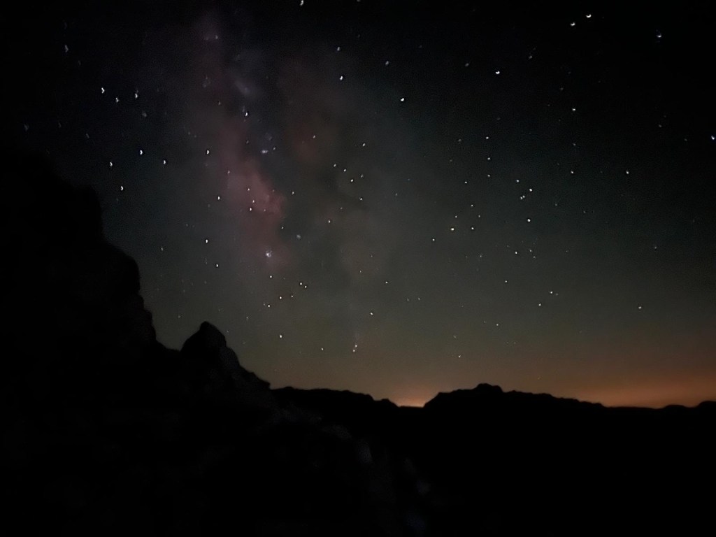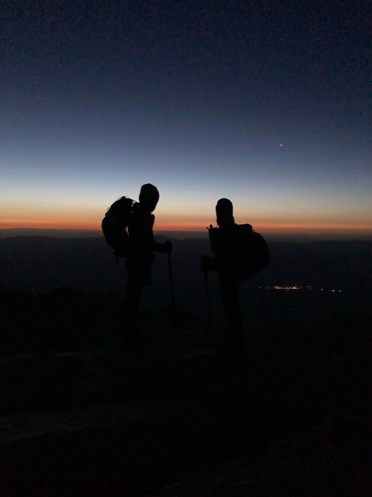 My alarm goes off at 11:15 PM on the night of the 6th. Time to hike! It’s all red headlamp and throwing snacks in my pack. The nice thing about this hike is that it’s essentially a slackpack: we can leave our tents and sleeping pads and whatever we don’t need and just take what we do. My pack is still pretty heavy because I’m taking every item of clothing I have and my sleeping bag, because the summit will be frigid.