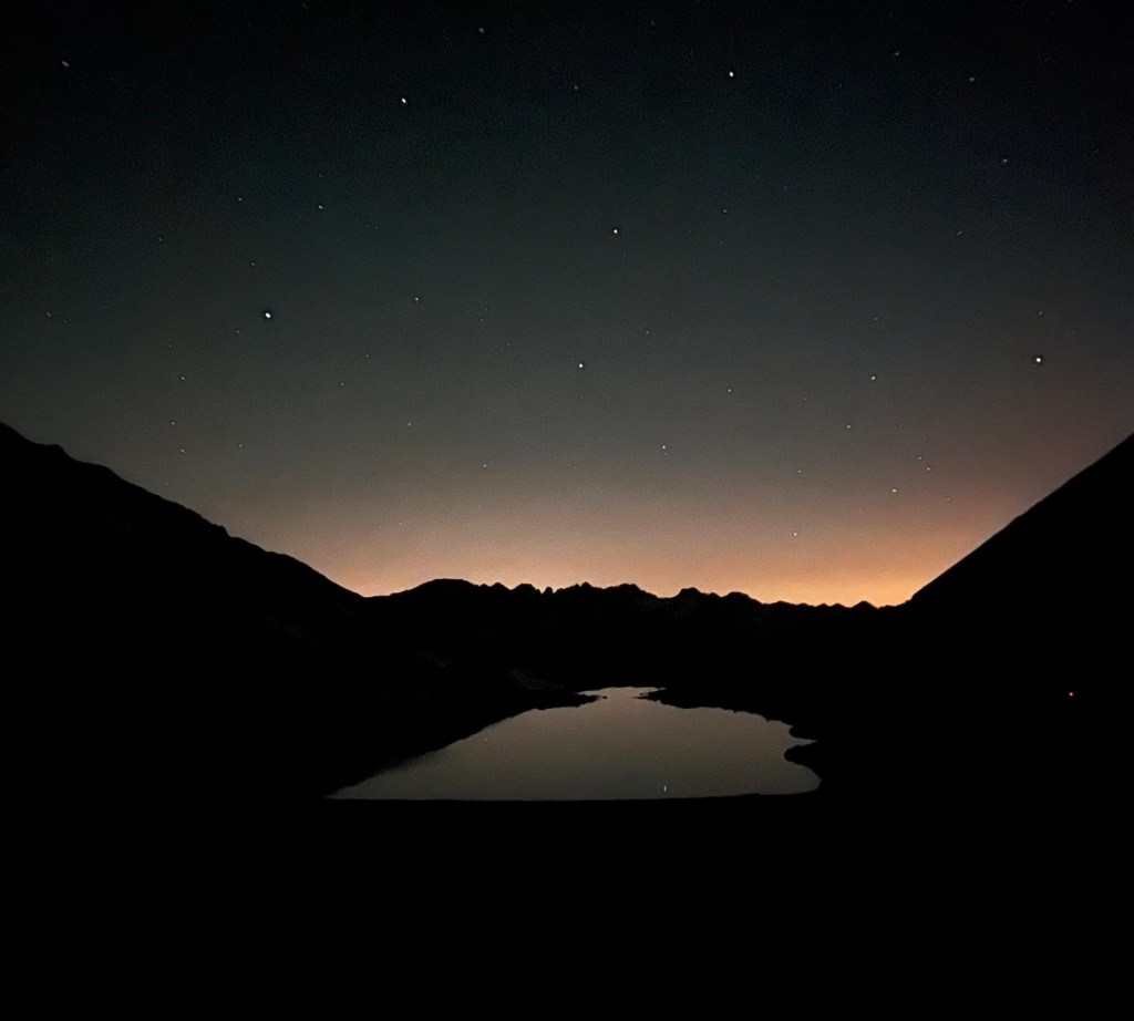 The first few miles are pretty easy. From my memory, we’re just going alongside the creek, and soon we’ll hit Timberline Lake and the trees will thin out into alpine fell-field. At the lake, we get our first glimpse of how the ambient light is reflecting off the mountains. We turn our headlamps off and see the gentle reflection of the rocky ridge in the water. The stars are pinpricks of glory in the sky above, and we can see the Milky Way. Alright. Fine. I hate night hiking, but this is beautiful. This is its own hushed magisterial wonder. I can get down with this.