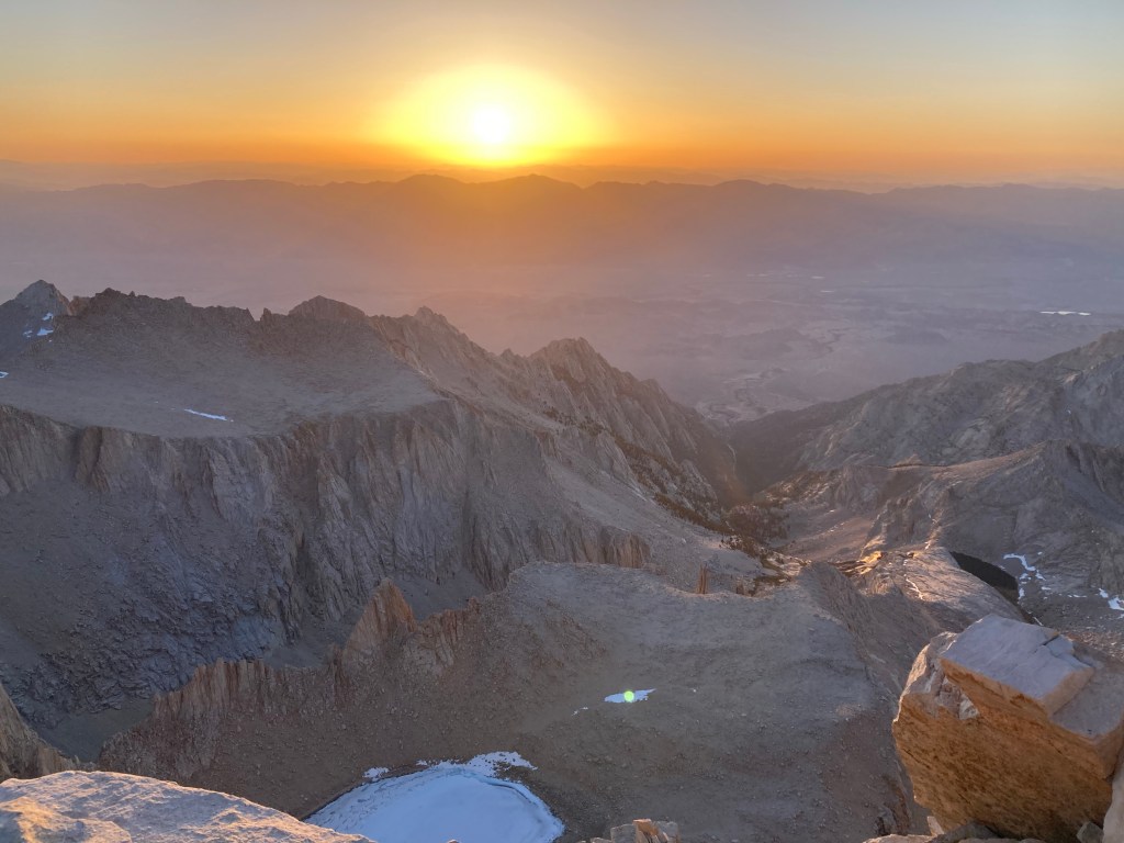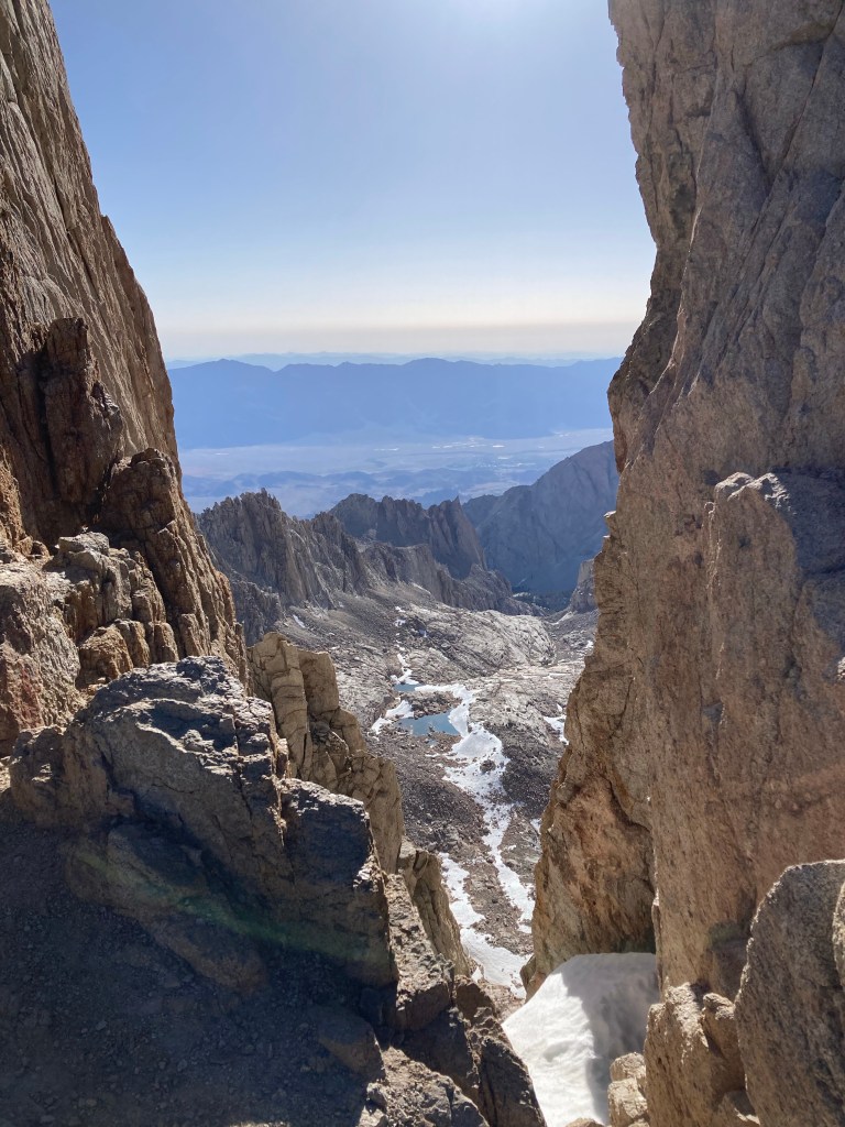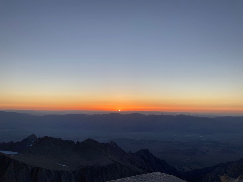 At the junction with the trail down to Whitney Portal, things start to get rocky—literally. The path goes from easily walkable to the surface of an alien planet. We walk along a ridge navigating irregularly shaped rocks as we pass the Needles and the windows where, during the daylight, one can see down to the Owens Valley and Lone Pine in the distance. It freaks me out. I’m starting to get dizzy, and every breath is an effort. I try to concentrate on my foot placement so that I don’t fall. It seems like we’re getting close to the summit, but then we see headlamps still on the side of the mountain far in the distance.