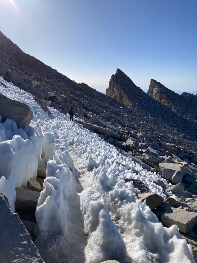 We stop to load up on water at the Guitar Lake inlet stream. I’ve been drinking a surprising amount already, so I get two more liters since it will be four miles to the summit and four back before I can get more. The trail starts to really get serious after that. It meanders vaguely uphill, passing a little pond where we can hear frogs ribbiting, and then we’re on the side of the mountain properly switchbacking. They’re small at first, then the really long ones start. This is what I remember. This is where the hike starts to grow up and get serious. We go all the way across, then sharply turn and head back up. I have to take an awkward pee break between a couple of rocks. I’m definitely getting more cavalier about my proximity of such stops to the trail and to my tramily. You gotta do what you gotta do, man. Also, at one point, we come around the corner and see Ishay camped at the Chad Spot, still asleep. What a legend.