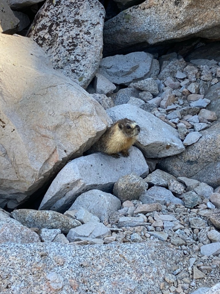 The descent takes forever, but it’s arguably the best part of the experience. We can actually see the mountains and lakes that were soft faint outlines in the darkness. I love how the perspective changes as you round a corner or turn another switchback. We spot a marmot poking out of a hole in the rock, then more marmots all over the meadows and rocks once we get down to the lakes.