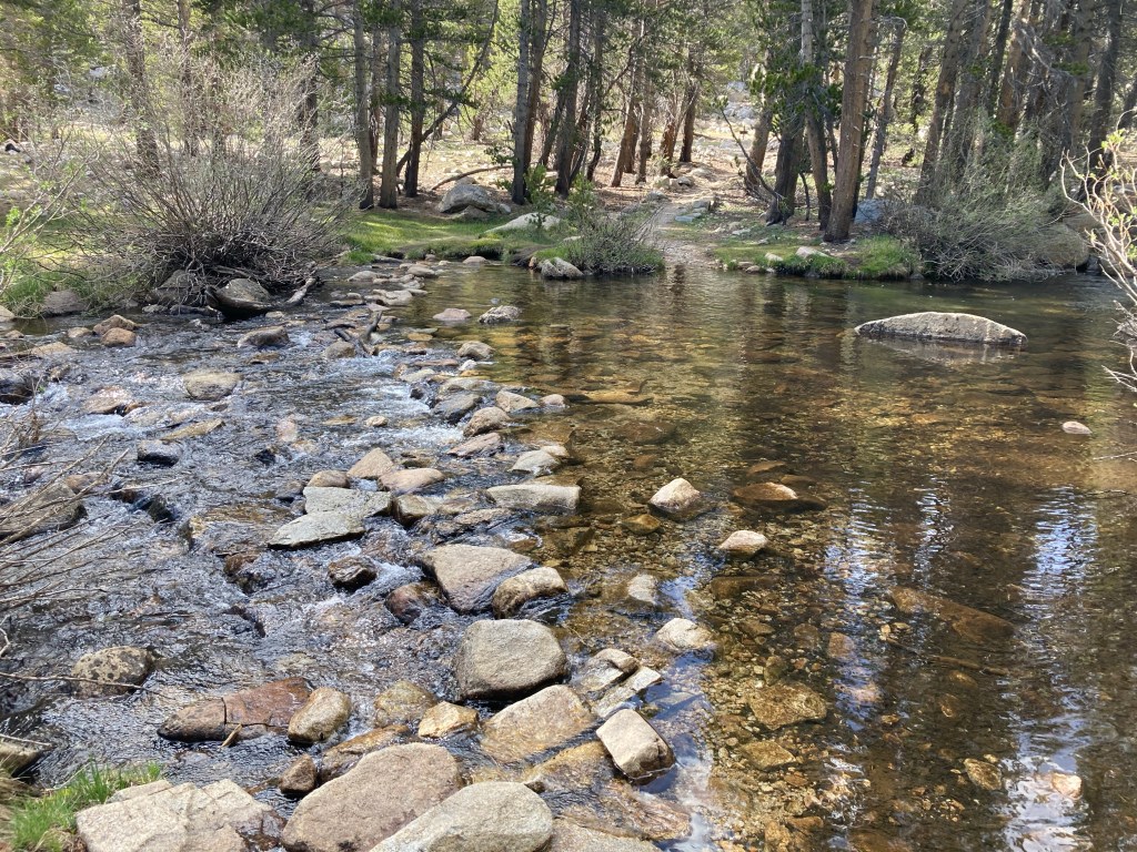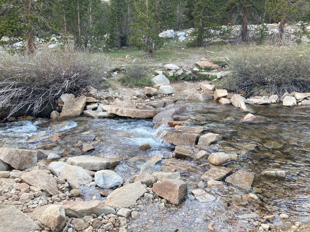 At first, I feel worn out and rusty. My body is like, “Excuse me? Do you not remember that you hiked to the top of the highest mountain in the lower 48 today?” But then something kicks in—the green tamale pie, probably—and I start feeling pretty great. We have a couple of short uphills, then down to Wallace Creek. This was a torrent in 2017, but today it’s an easy rock hop. The same goes for Wright Creek a bit later. It’s unbelievable to me how different the water and snow situation is compared to what I remember.