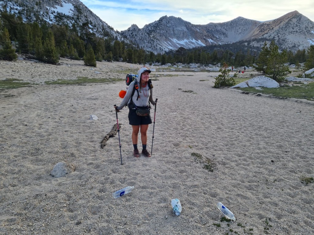 At the top of the hill, we run into several people camping, including Qwerty and Trash Balloon. Another group tells us that they saw multiple bears. We decide to go into quiet mode as we turn right onto the Kearsarge Pass Trail. Maybe this will help us spot a bear—what a way to end this magical day that would be! We start walking silently on the sandy, pebbly path. I’m looking around for bears, and in the process of not watching where I’m going, I trip over a rock and both of my water bottles and my toilet bag go flying and land on the ground. The three of us fizzle into hysterical laughter. Classic me. No hope of seeing a bear now.