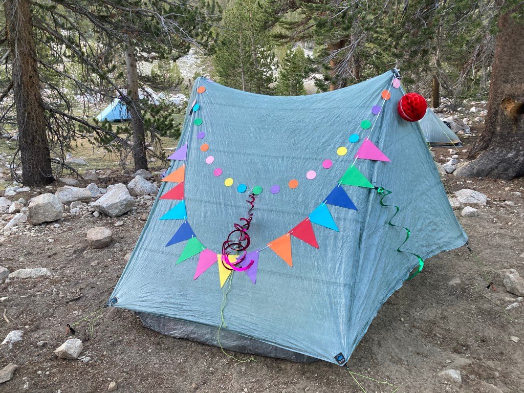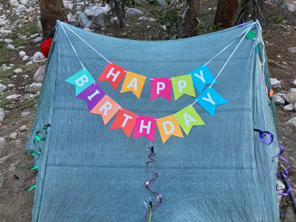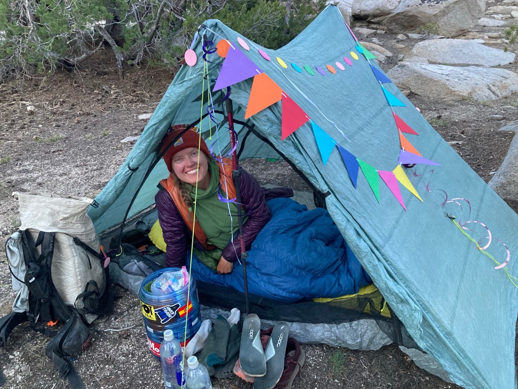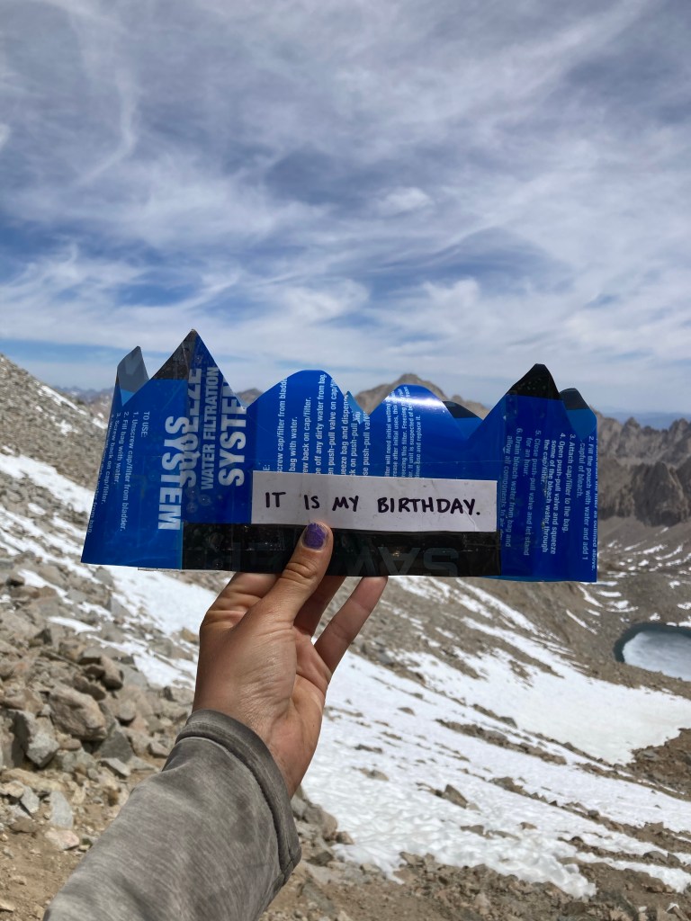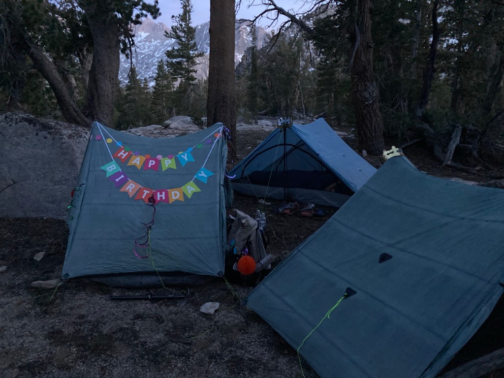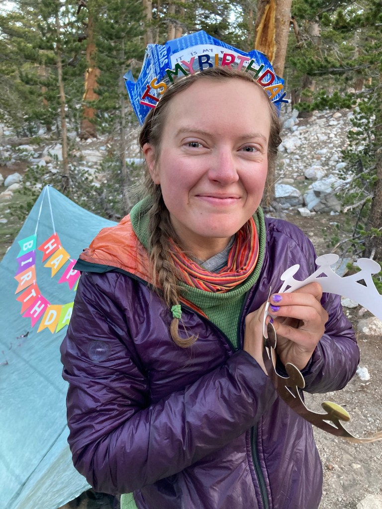 It was a great birthday, full of unexpected surprises and beauty and joy and friendship. I’m grateful for my friends who wear crowns to celebrate and cover my tent in decorations. I’m grateful for the towering mountains that are my home, at least for a little while. I’m grateful for the magic that is the PCT and the unbelievable privilege I have to experience it.