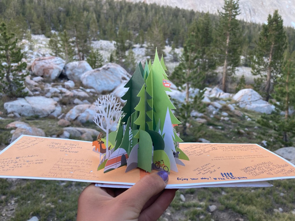 I get out of my tent and inspect Jumbo’s work. My Duplex is completely covered in decorations: a “happy birthday” banner, colorful paper flags on a ribbon, little twirly shiny plastic thingies. “Oh my god,” I say, laughing. I run over to him. He hugs me, tells me happy birthday, and then hands me a card. It’s one of those pop-up ones with a scene in the middle, and this one has, appropriately, pine trees, deer, tents, a camper, and all sorts of other little crunchy woodland things. So many people have signed it: Pants (yep, still weird), Beetle, Catless, and Jumbo, obviously, but also the Belgians, Ishay, and the step-tramily—basically everyone who was at Kennedy Meadows with us. I’m mildly shocked that this doesn’t make me bawl my eyes out. I thought I was good at birthdays. James is next-level.