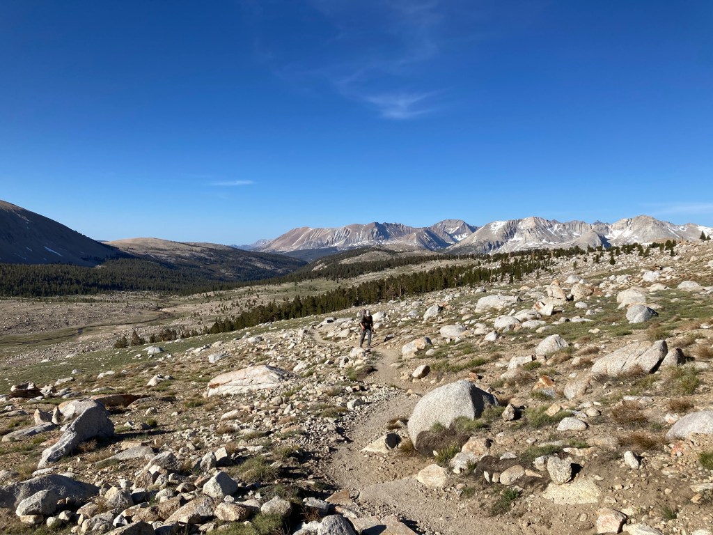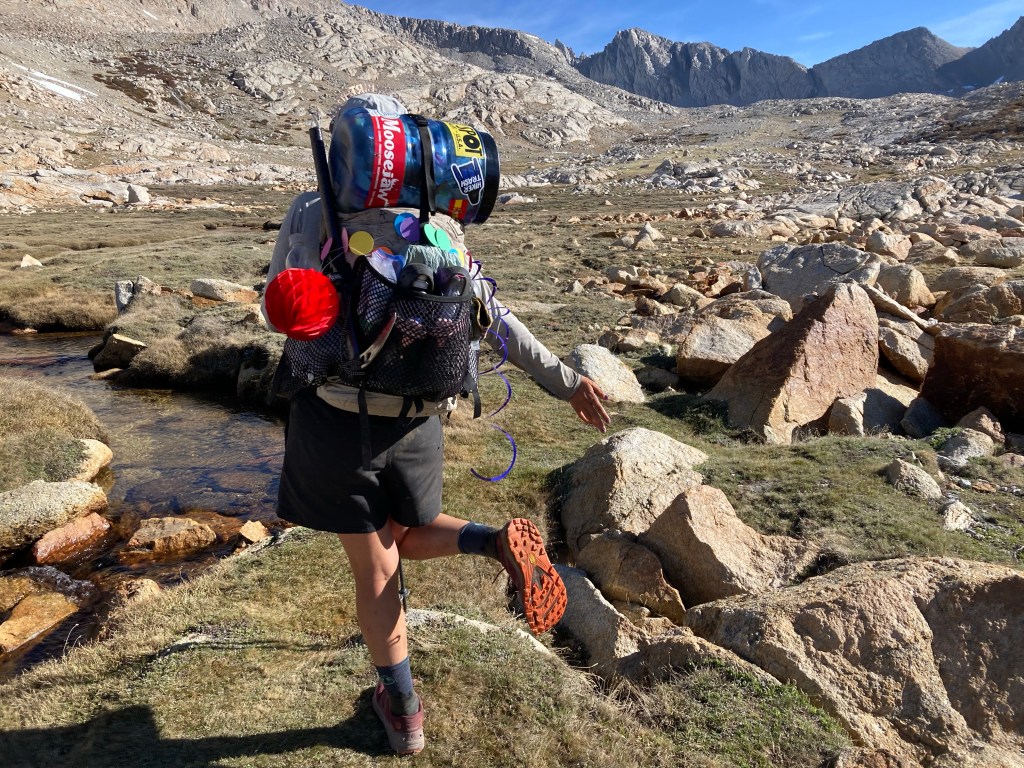 I eventually collect myself enough to pack up. It takes me a long time to extricate my tent from the strings and ribbons, but when I finally do, I save some of them and put them on the front of my pack. By the time I’ve done that, eaten breakfast, brushed my teeth, and finally gone for that pee I was putting off since 4:45, only Jumbo and I are left at camp. Ishay came by and got his crown, and the Belgians shouted happy birthday as they hiked out, but now everyone has left. We boogie out and into the meadow that will take us to Forester Pass. Time for the most epic birthday ever!