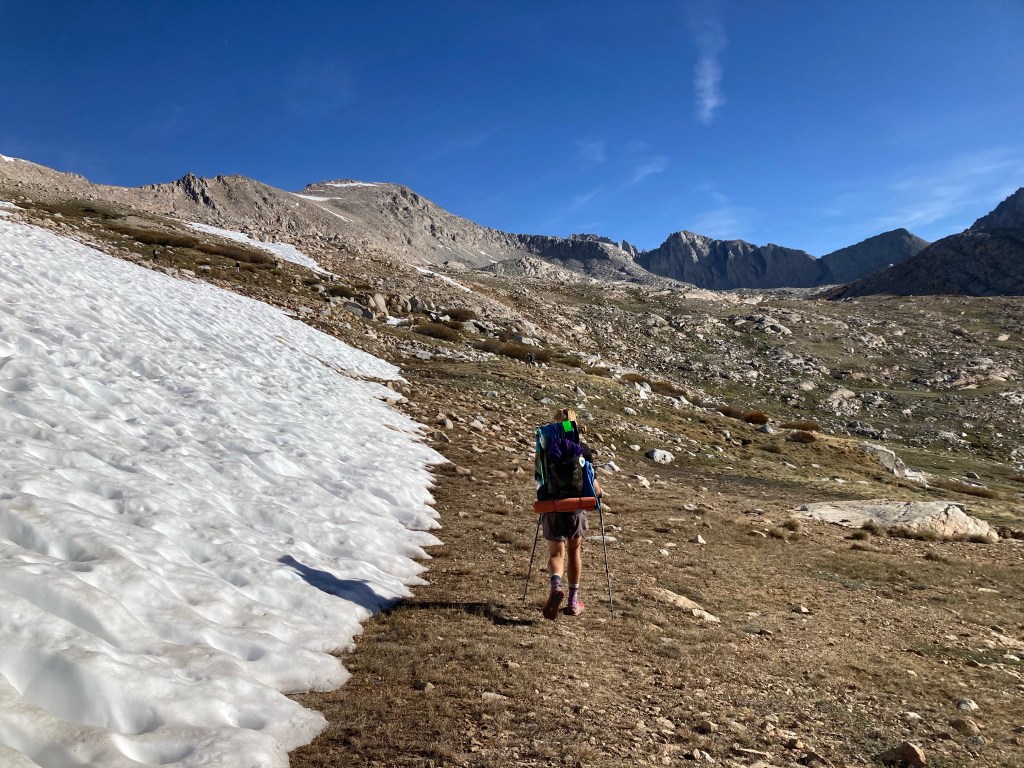 The altitude hits me again on this pass, and I have to take it slow. It gives me an opportunity to look back into the snowy, lake-studded basin we just came from and the craggy mountains in the distance. It’s just as unreal as the first time I was here. I can’t wrap my head around the existence of these mountains. They are so towering, so beautiful and imposing. As I walk up, I think about how lucky I am to be here and how epic it is to celebrate another trip around the sun by climbing the highest point on this long, special trail.