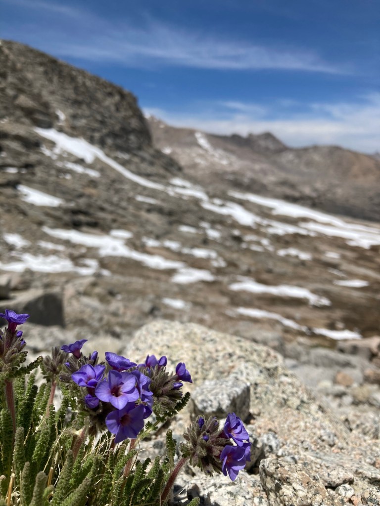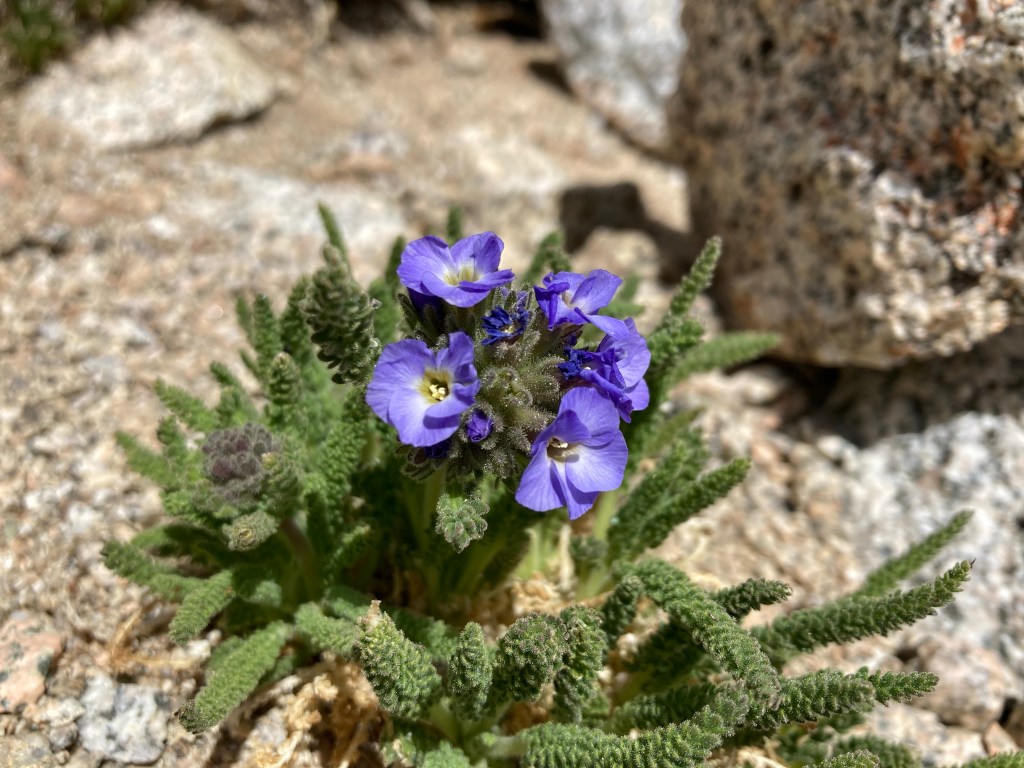 We take tons of photos in various configurations with the sign and with the views. Obviously, I’m wearing my IT’S MY BIRTHDAY crown that Jumbo got for me, which requires many shots, but I also take photos with my glorious handmade crown that I scavenged from the Kennedy hiker box. We talk with a JMT hiker named Ko-J (or maybe Kojay? KOJ? He said it’s “like OJ, but with a K”), who takes a photo of the four of us. I only find one little sky pilot blooming, but I am so excited to see them again here on this pass that I don’t mind the small showing. I take photos of them, put my pack on again, and then we start the descent.
