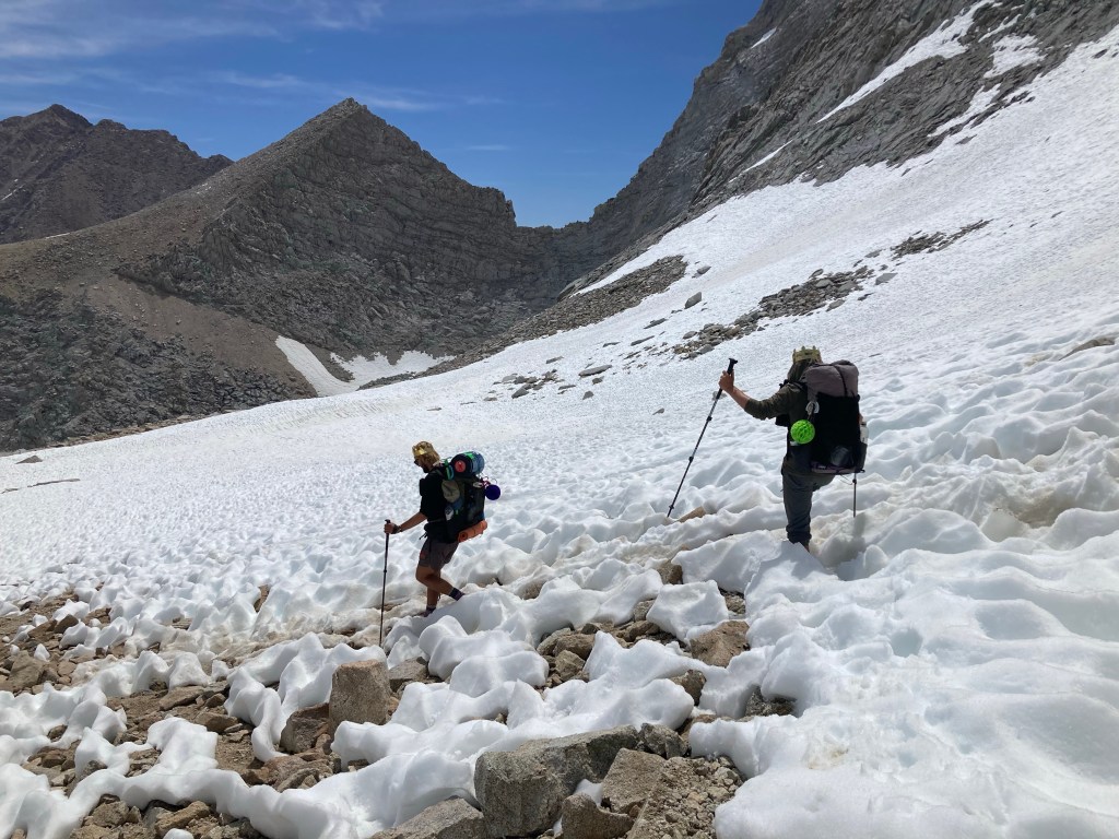 The morning is surprisingly hot. We catch up with Catless after he sheds his puffy, and then the three of us walk together towards this infamous pass, the highest point on the PCT. I remember it clearly from the JMT, and I know from experience that it is far from the hardest of the passes and that we will have plenty of time to get up and over it before lunch. We start out fast, then slow down as Jumbo starts to wilt in the blazing sun. Despite the heat, there are snow fields everywhere that we have to navigate, which mostly involves going off-trail until we find the PCT again.