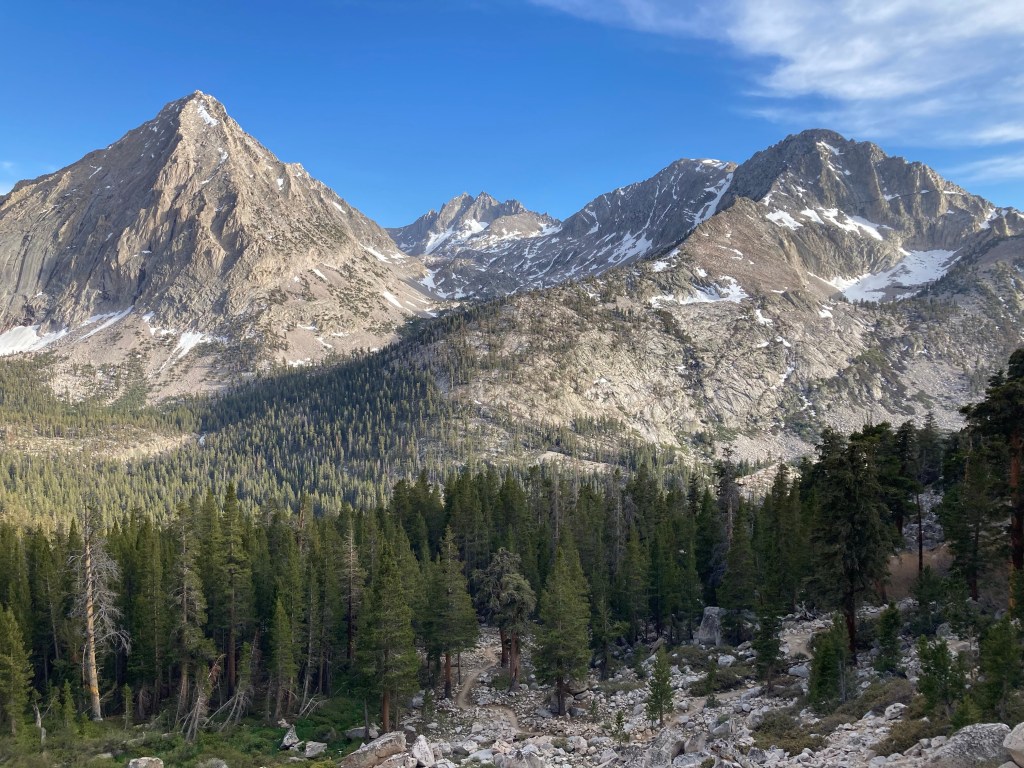 We start working on the hill that will take us to our campsite, switchbacking up the mountain. I remember this climb from the JMT because I couldn’t get over how perfectly shaped the mountain across the valley was. It’s just so mountain-y! We marvel more and more at the view as we make our way. It’s not a bad climb, but I’m pretty tired, and I kind of want to take in the last couple of miles of my birthday. I trudge slowly behind Jumbo and Catless.