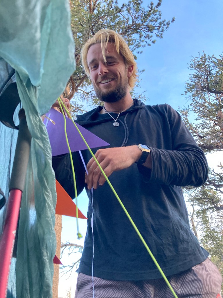 We wind up at a small campsite nestled between rocks and trees. We set up our Duplexes in a triangle, with our doors opening up into the middle so we can talk. We were hoping to camp with the Belgians and other folks we know, but we don’t see anyone. Ah, well. It just gives us a nice quiet place to rest after this magical day. Jumbo decorates my tent again, and this time I get to watch the process. I eat more food out of my bear canister just because I can. My rationing has paid off, so I can eat an entire probar and my Wild Zora meat bars. Wahoo!
