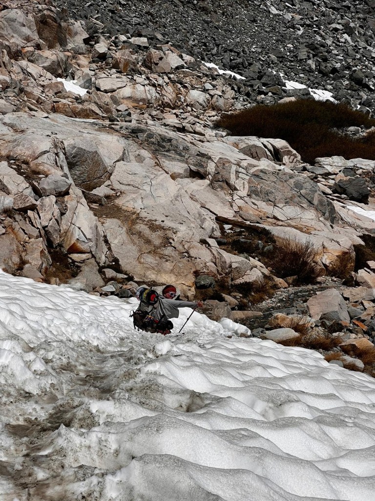 Glen, like Forester, is much less snowy than it was in 2017. The south side is completely snow-free. I struggle under the weight of my bear can, but it doesn’t take us too long to get to the top, all things considered. On the way down, we run into some snow patches. Again, it’s nothing like five years ago, but it’s a little slippy. I don’t put my microspikes on because it doesn’t look bad from the top, but I regret this when I’m most of the way down after I’ve slipped and fallen three times. It could have been way worse, but it’s annoying.