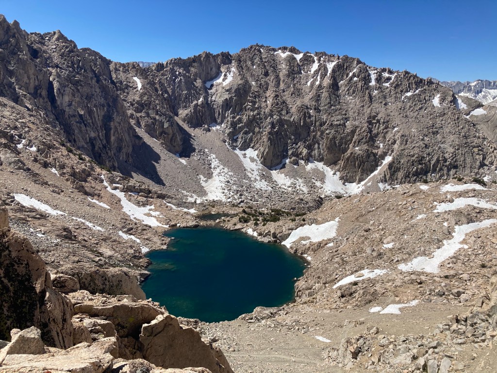 It’s so cold. It’s a shock after two days of heat down in Bishop. We leave camp around 7 and get back to the PCT, go a few more miles, and then take a coffee and second breakfast break, if only to get rid of some of the weight and to wake up from the chilly morning. It turns into a longer break than planned, obviously, but eventually we get packed up and moving again towards Glen Pass.