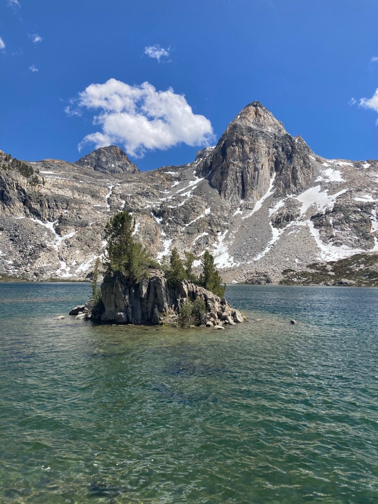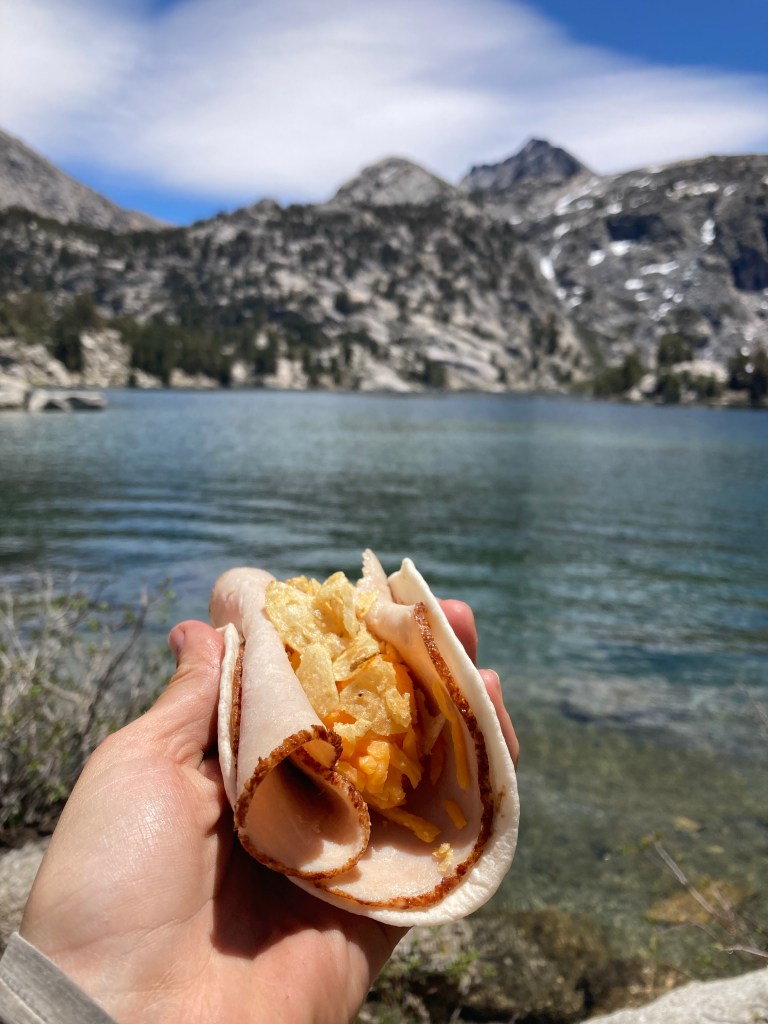 The real reward of finishing Glen Pass is Rae Lakes. These two lakes connected by a strait are mind-blowingly beautiful, with islands and a thin strip of land between them covered in trees. We stop right before the crossing for lunch, which is a turkey and cheese wrap, chip drink, and M&Ms. Afterwards, Jumbo and I fall asleep right in the sun. I wake up with a start and realize it’s 2:00. Mildly panicked, we pack up and carry on, but not before the lovely but very wet crossing.