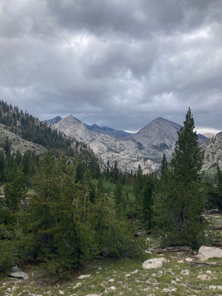 As the trail starts to turn downwards towards Woods Creek, a nasty looking bank of clouds rolls in over the mountains and the wind picks up. It gets cold, despite the fact that we’re actively moving. There are big steps with scree all over them, and my feet are starting to hurt from the weight of my pack. It’s still beautiful down in this valley, and I am taking in the views as I move downwards, but I am feeling very, very tired. Dehydrated. Exhausted from this weight.