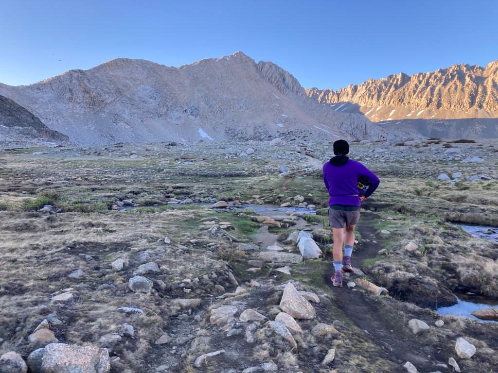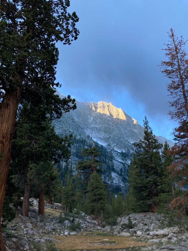 It’s warm when I wake up, which is a pleasant surprise. It’s also 3:45, which is less pleasant. I groan and get out of my tent to pee, then have to re-inflate my air mattress before I sleep for another hour and fifteen minutes. I snooze my alarm and wake up for real when I look over and Jumbo’s tent is gone. I hear him packing up and panic. Ah, shit. At least I slept really well. So far the Sierras have been helping me out with that at least.