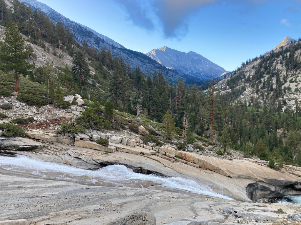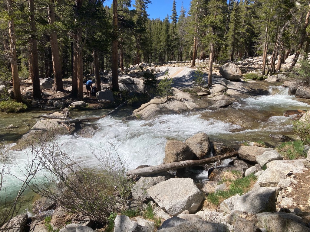 On the other side, we take a lunch break at Lake Marjorie. It’s windy but beautiful. After that it’s a gorgeous afternoon passing lakes and lake outlets and all the way down to the South Fork of the Kings River. I walk with Jumbo for a bit, but neither of us talks. We’re simply looking around and drinking it all in. Soon we come upon the South Fork of the Kings River, which is one of the more notorious creek crossings. It’s fast, but not too deep, and we all cross it safely.