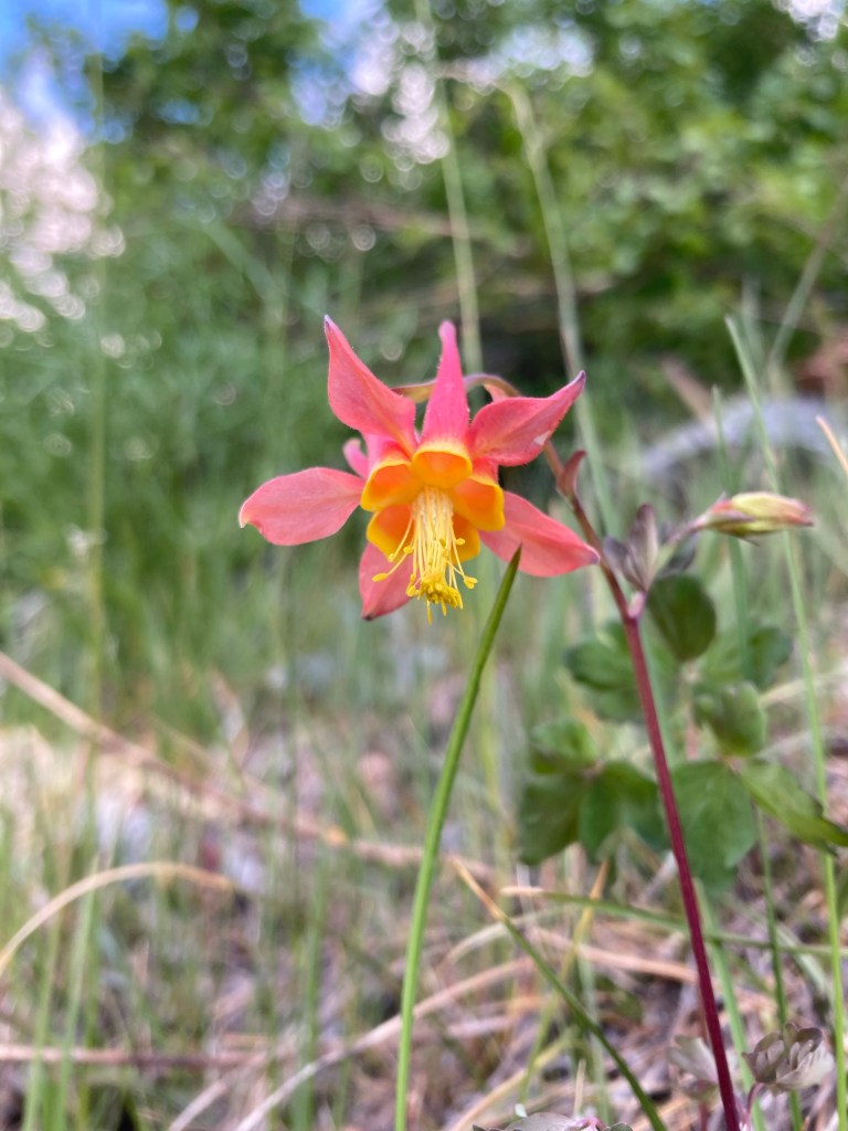 At one point, I notice that columbine is sprouting from the side of the trail. It’s a beautiful, complex reddish-peachy flower with yellow stamens, and between the soft gray-blue sky, the roaring water, and the beauty of this columbine, I feel something start to soften in me.