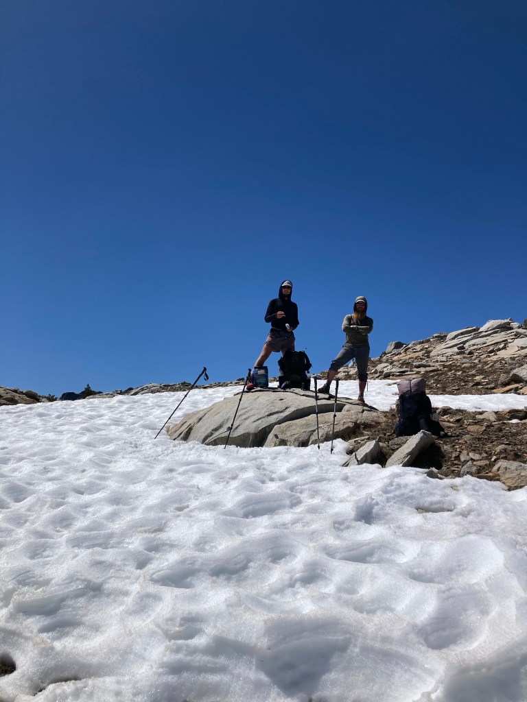 So, I trudge slowly upward and try to remember that even though not every moment will be great, there is nowhere else I’d rather be. I put in some music, which helps. Woods Creek keeps following me up. I catch back up with Catless, then we find Jumbo and take a quick break before continuing the last three miles of the trek upwards. I lose them again, have to dig a cathole, have to eat a snack, and then finally keep moving. I finally find the boys again, waiting for me on a rock surrounded by slushy snow.