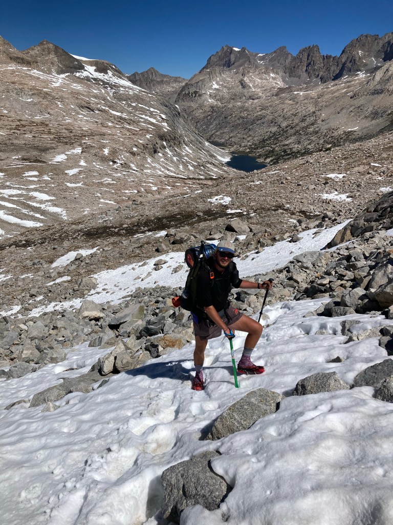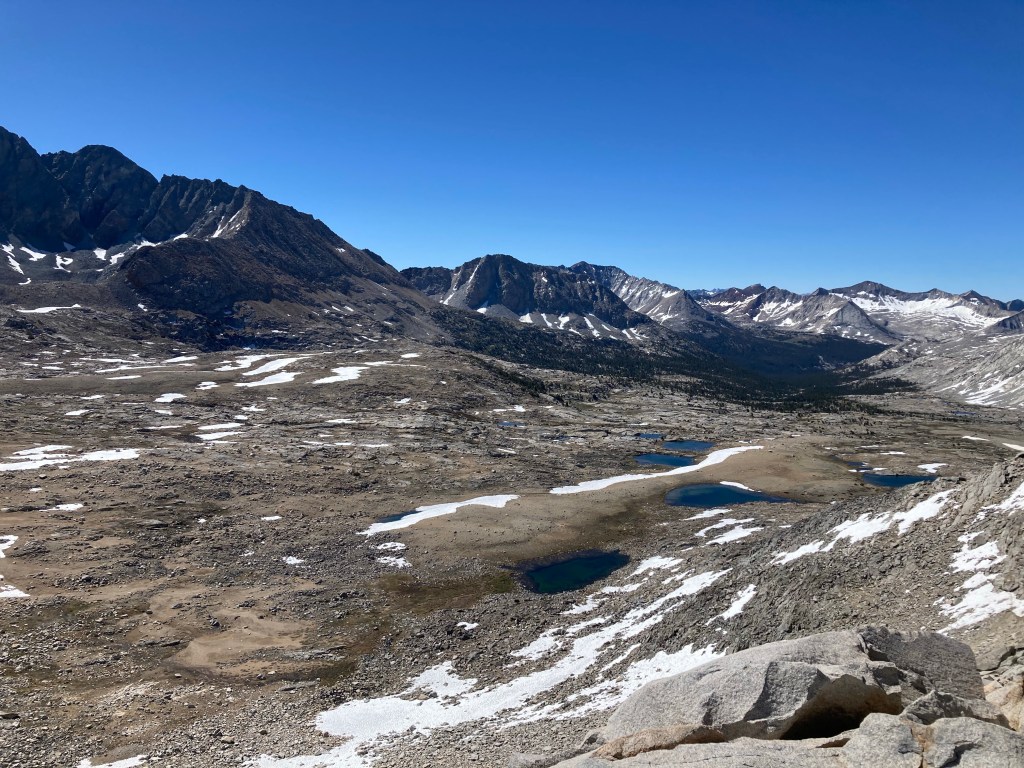 We start up Mather after 9. It’s a satisfying climb and there is no snow on the south side at all. This is another one of those “how is this the same trail as in 2017” moments. This pass was covered in snow the year I did it, and I used my axe and spikes pretty much the whole ascent. Today it’s a series of lovely switchbacks. I keep trying to use my sunglasses, but they’re smudged and scratched so badly that it feels dangerous.