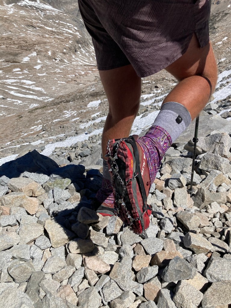 At the summit of the climb, we talk to some folks doing a shorter route on part of the JMT and surrounding trails. They tell us that the north side of this pass is pretty snowy, and that we might want to use spikes but an ice axe isn’t necessary. After my experience on Glen, I’m keen to use spikes. Jumbo is too, so we suit up while Catless blazes ahead undaunted. We also pull out our ice axes, because why not. We have them. They might as well get used!