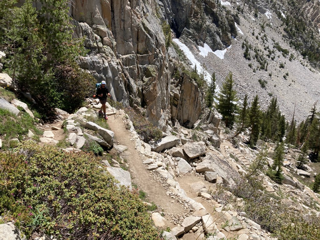 Soon we’re turning downwards onto the Golden Staircase, a long series of small switchbacks that work their way down from Palisade Lakes to Deer Meadow. (It’s not labeled Deer Meadow on Guthook, but I’m pretty sure I remember that from my JMT topographic maps, so we’re rolling with it.) I’m glad to be going downhill, but it’s still not exactly pleasant as the trail consists of large steps and irritating rocks. It’s getting hot, too, and I sense that Jumbo is starting to do that wilting thing he does in the sun. Heck, I’m wilting by the time we get to the Palisade waterfall. We sit in the spray for a moment and then continue with a sigh. I’m trying to be conscious of the beauty around me, which I am, but my eyes are also burning up and my feet are screaming and I want to be out of the sun.