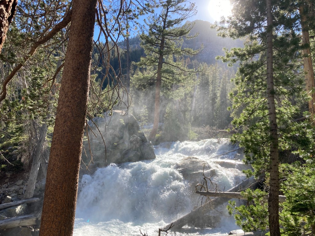 Soon we get up and start hiking the last five miles through my favorite part of the entire JMT section: LeConte canyon. This is another one that isn’t labeled on Guthook, but I will always remember its name and the way it feels to be here. Jumbo speeds ahead in music mode. I pull over to get a good view of the Middle Fork waterfall that is spraying mist everywhere. The evening light comes through the water and does amazing things.