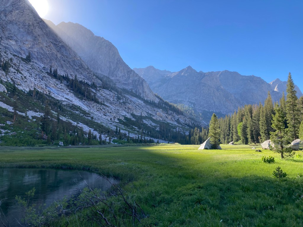 It feels like Alice in Wonderland, like something from another dimension. I see a clearing up ahead and something shifts within me. This is Grouse Meadows, the most magical place on the Nüümü Poyo. The light casts slanted rays as it falls through the towering mountains. It lands on a triangular rock with a tree growing right next to it. Otherwise, the meadow is wide and green. The Middle Fork, so gently a raging torrent, is here a slow, patient, meandering stream. I see Catless and he points me to a deer grazing on the opposite side of the water. Then I walk forward into the meadow and stand there beneath the light remembering the last time I was here and feeling the same spell.