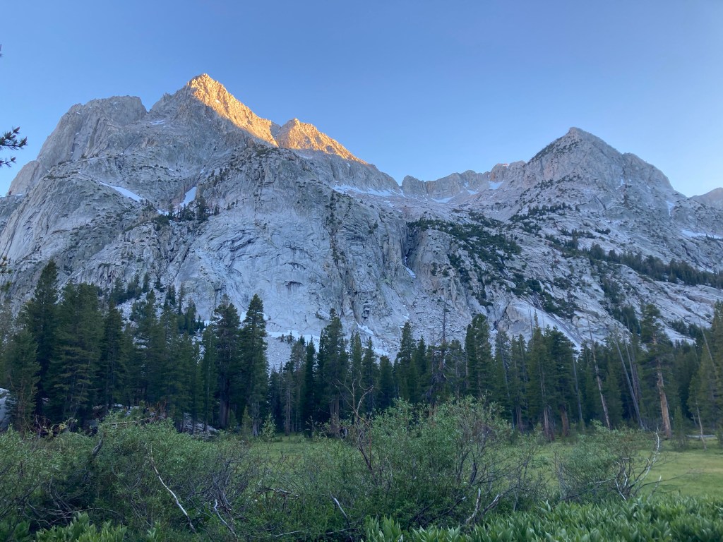 For the next four miles, I try to balance taking in the night of LeConte Canyon and hiking fast. I feel pretty good and I don’t want to lose my momentum. I don’t listen to music; the music of the river is what I want for now. That evening light pouring through the mountains does such things to my heart. This canyon is cool and calm as I work my way up. There’s another waterfall; there’s the Citadel with its impressive towering face. Up, up, looking back down at the raging river, looking ahead to McClure meadow. We see Jumbo waiting for us at a stream crossing, and the three of us slowly make our way the last mile and a half to camp.
