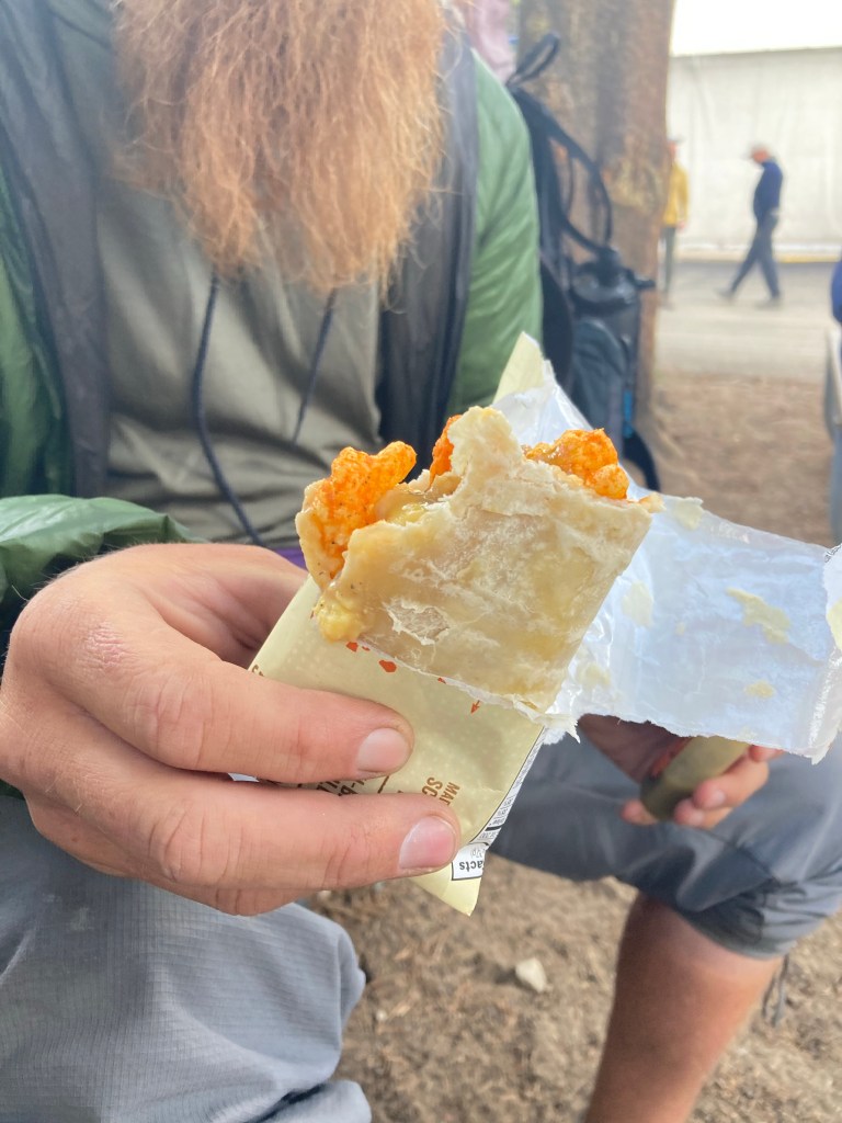 It’s not a great selection, not by thru-hiker standards, but we manage to find a few things. I grab a microwave burrito and some coffee on top of my food for the next four days. Outside, we eat our miraculous snacks, drink our coffee (seven of them in Jumbo’s case, I believe), and repack. I look over at Tribute and see him putting Cheetos in his burrito.