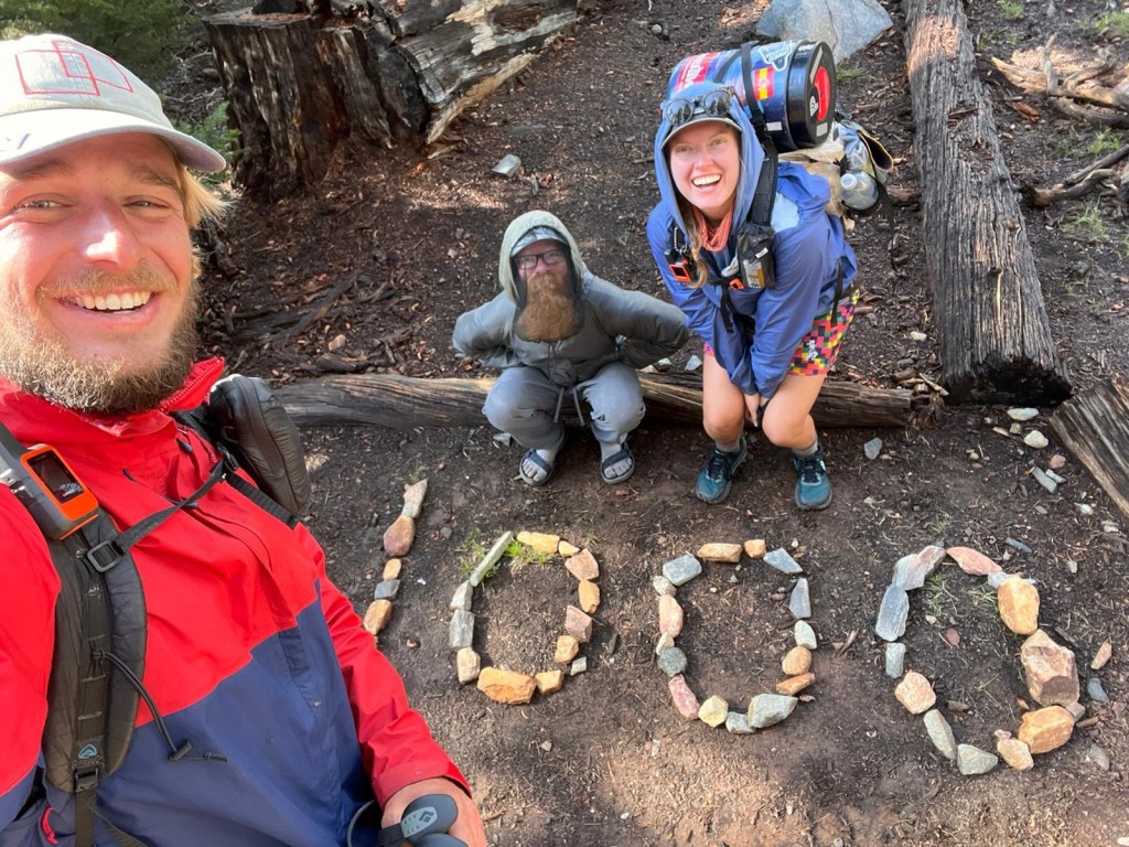 There’s a pretty sketchy river crossing after that. The rocks are slippery, the area surrounding them is deep, and there’s a small cascade right downstream. Not my favorite. But I make it across. I have a burst of energy after that, so I zoom downhill and run into Jumbo just as he starts to munch on a clif bar. The mosquitoes are next level here, though, and we can’t keep still. Once J is finished, we continue together to our big milestone of the day: the 1,000 mile marker!