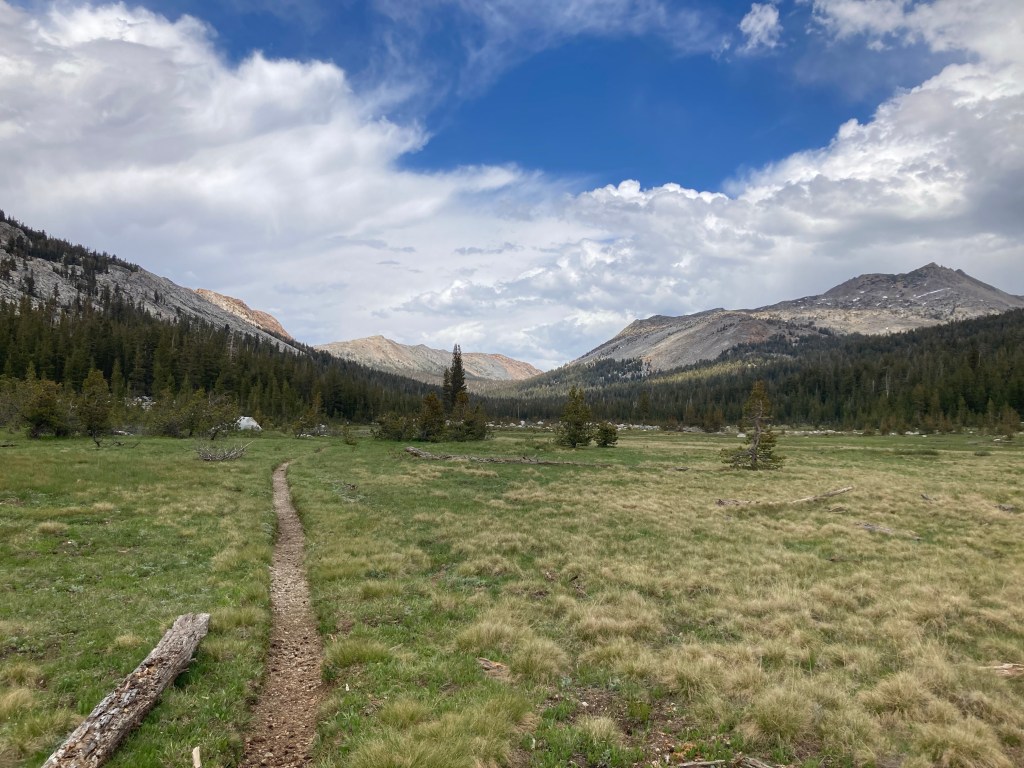 The trail is gentle for the next six or so miles. It’s vaguely uphill, but it’s not noticeable; it feels flat to me. There are lush forests and then a huge meadow with snow-dotted mountains surrounding it. Turns out, we’re still in Sierra land. I’m loving it. There’s a thunderstorm rumbling in the distance, but it’s not close or severe enough to worry about, I don’t think. It’s turning the world gray and drizzly, England style. My audiobook ends with a sad, dramatic finish and I switch to music. Tribute catches up and we hike over the pass and downwards.