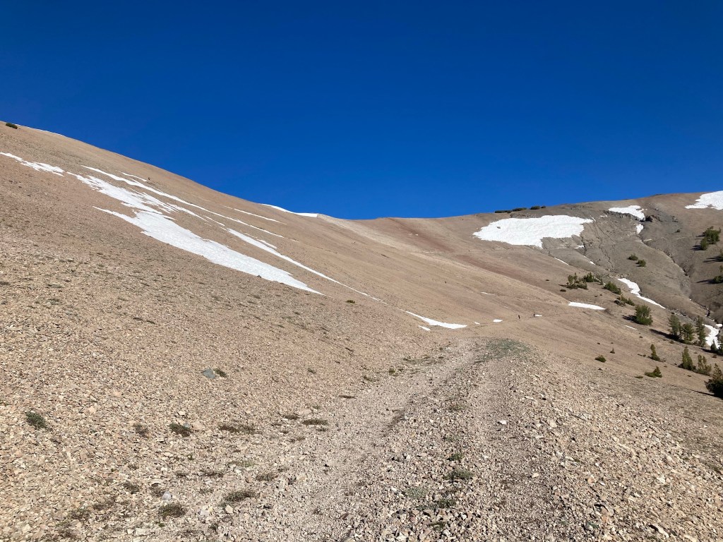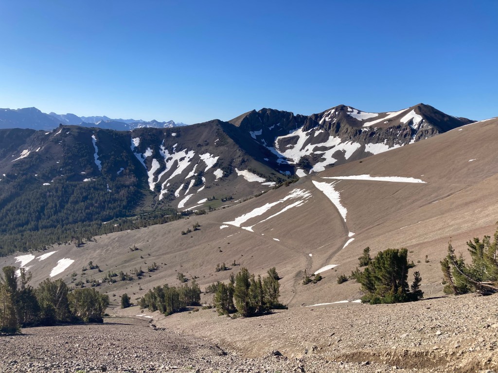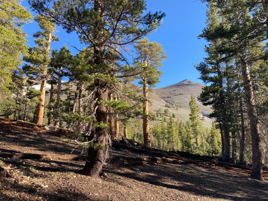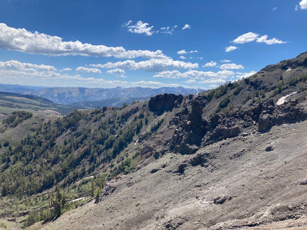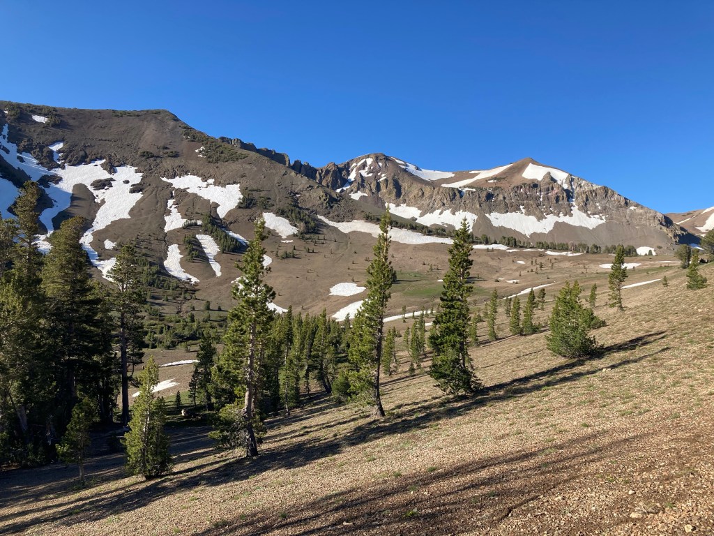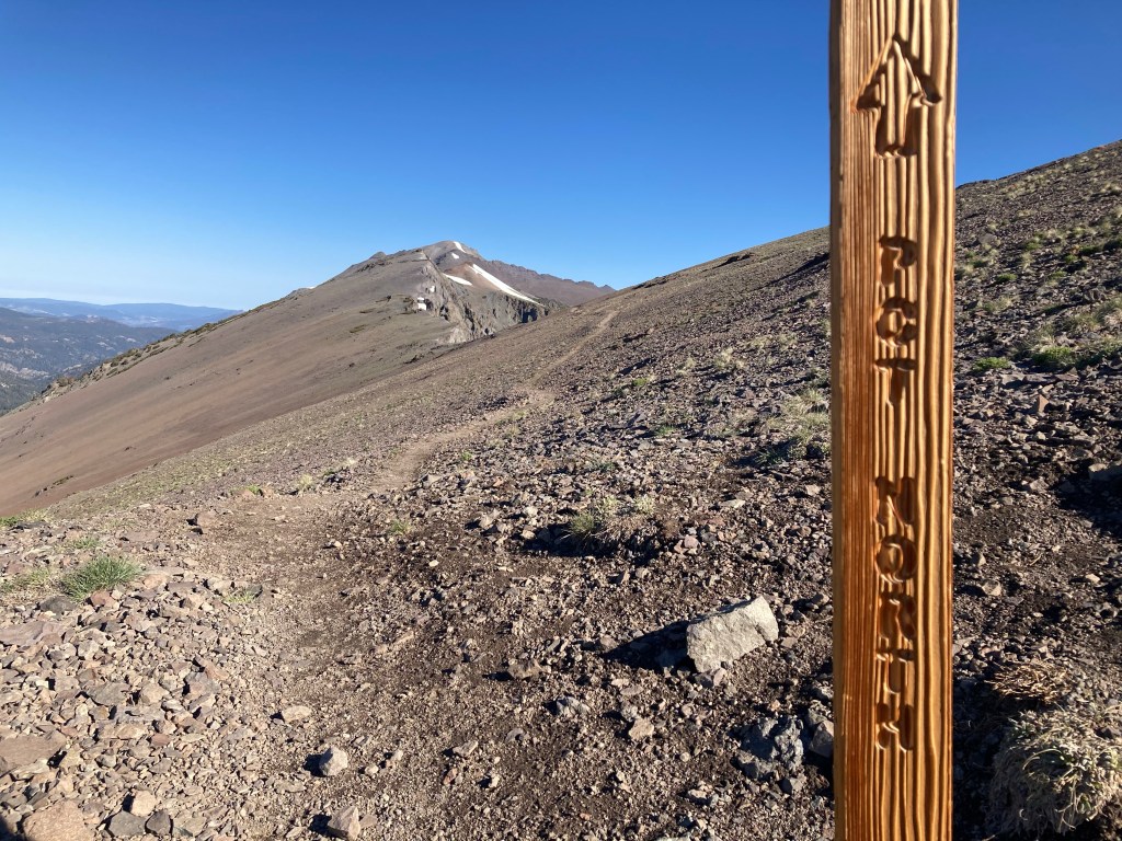 Turns out, it’s actually a ton of fun. I don’t typically use the word “fun” in the same sentence as “big climb,” but I love it. I put on Heard it in a Past Life by Maggie Rogers. It’s one of my favorite albums, but I haven’t listened to it in a hot minute, so I hear it with fresh ears. And it absolutely slaps. The trees thin out and I can see views in all directions. There are still mountains with snow, but they aren’t the granite faces of the Sierras anymore; they are reddish and crumbly, like something volcanic. Basalt, maybe? The ten minutes of studying I did on PCT geology didn’t stick with me, but it’s definitely a different kind of rock and a different world now.