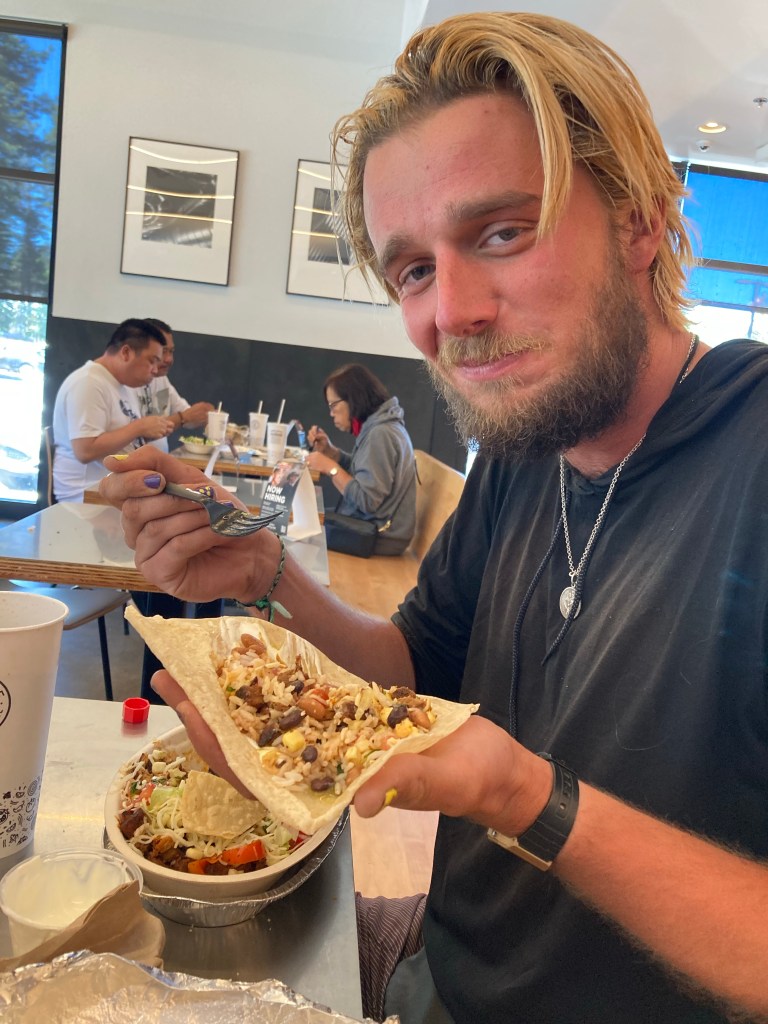 Our driver drops us off at Chipotle, which we’ve been fantasizing about for days. I can’t remember if I wrote about this, but on the first night of the PCT at Hauser Creek, Jumbo told the story of how he was so excited to go to Chipotle in San Diego, but he didn’t know what to order, and somehow, he ended up with a rice taco. Like, literally just rice in it. I thought it was hilarious, and Andy and I laughed about it many times over the course of the first week. I was determined to get Jumbo back to a Chipotle and order for him so that he could properly experience it. It’s a very big moment when he takes his first bite of the gargantuan burrito bowl piled high with steak and chicken. He loves it. Meanwhile, Tribute and I both smash our own bowls. In everyday life, it’s impossible for me to consume a whole Chipotle bowl, but this is trail life, baby. It’s so satisfying.