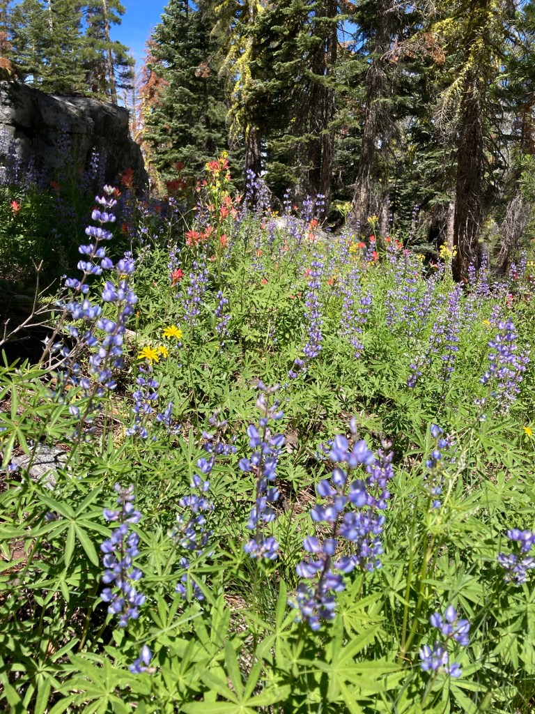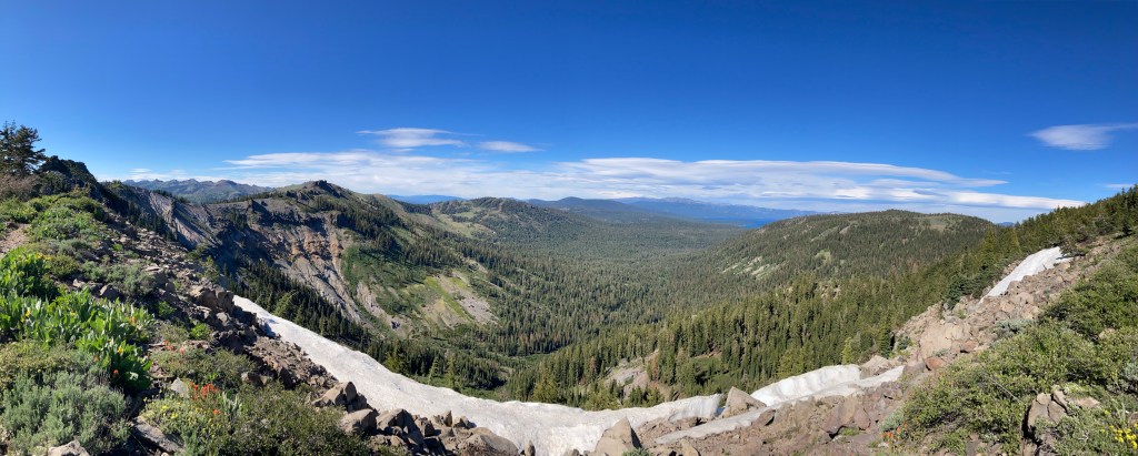 I’m starving at the top of the climb, and I also have to pee, so I take a good break and then continue as the trees thin out and the trail turns into a windy ridge with sunny golden views of Tahoe and ranges in the distance. The wind is annoying, but the vistas and wildflowers make it more than worth it. I love ridges like this. I love being able to see so far and know exactly how big this world is and how small I am. I pass a ski lift, then shortly after that, I’m going downhill.
