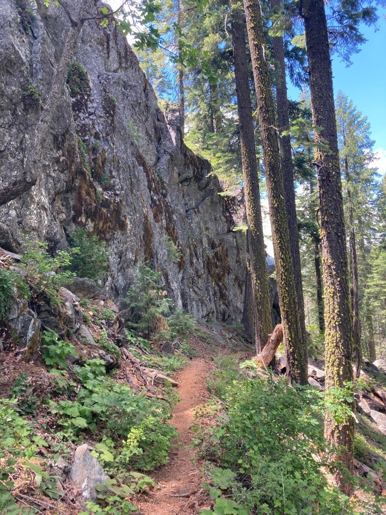 We walk together for a long time after that. The trail keeps oscillating between verdant, fragrant forest and mule’s ears ridges with windy views for days. We stop for lunch at a campsite just shy of ten miles. It’s not even 11 yet, so we take our time. I lay my tyvek on the ground and write for a while, somehow resisting the urge to fall asleep. This is such luxury. Somehow my brain is still in Sierra mode, and it feels weird for miles to be coming so quickly and to be able to relax.