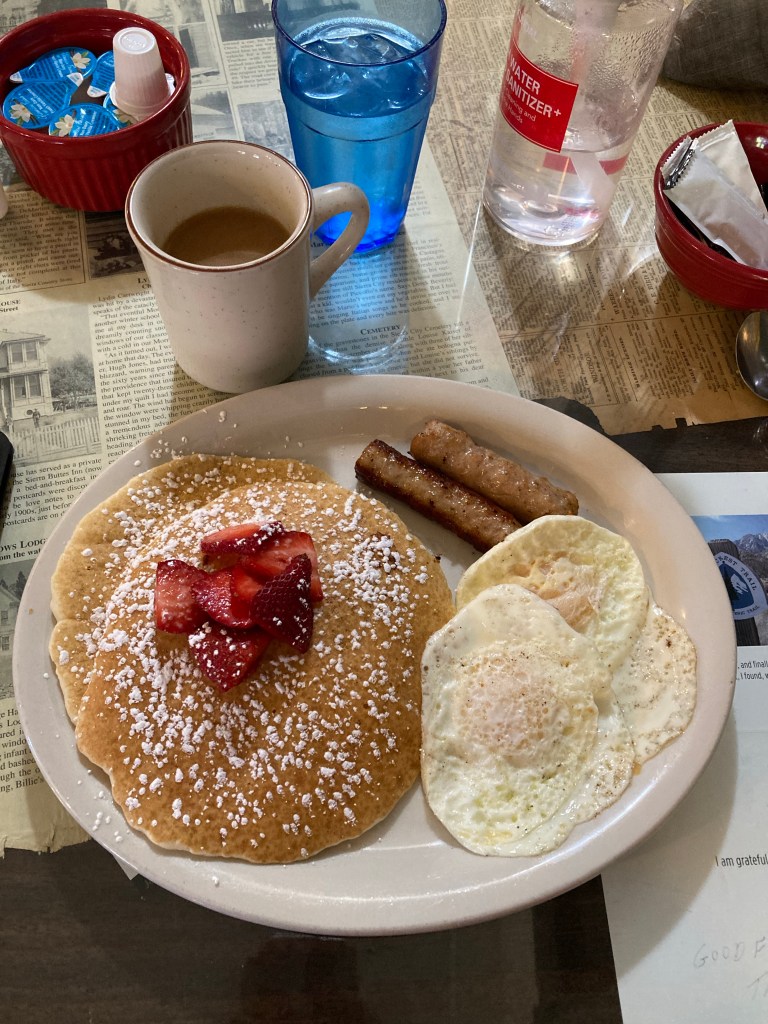 Breakfast at the Red Moose is delicious: two pancakes, two sausage links, and two eggs over medium. It’s a little small for hiker standards, but I enjoy every bite. I sit there writing and drinking bottomless coffee for ages, thinking of how Jumbo would be so thrilled when the server brings over the carafe for free refills. Despite this, I’m still glad I’m alone right now. It feels like such a needed reset. I haven’t been on a breakfast date with myself in… have I ever been on a breakfast date with myself? It’s about time.