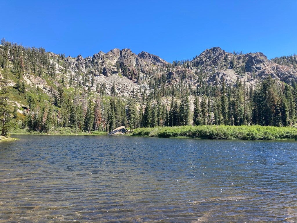 The climb is never steep, but it takes forever. It’s after 2 by the time I’m finally on the dirt road at the top. I would stop here for lunch, but I don’t have water, so I continue down to Upper Tamarack Lake, nestled right below the towering peaks. I eat my wrap and stretch, but I don’t take too much time because I’m determined to get 20 in today even though I started super late.