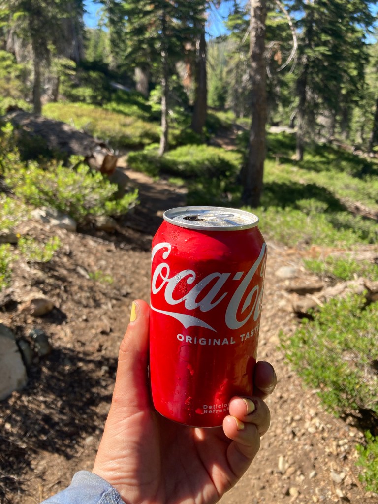 After lunch I cruise downhill until I reach a surprise: a cooler set up right on the trail with cold sofas. What! Such magic! I reach in and grab a coke, crack it open, and nearly melt in delight. Why does soda taste so dang good? I drink it while I walk down to the forest service campground at the bottom of the hill, then recycle the can and use the very clean pit toilet before crossing a creek and heading uphill once again.