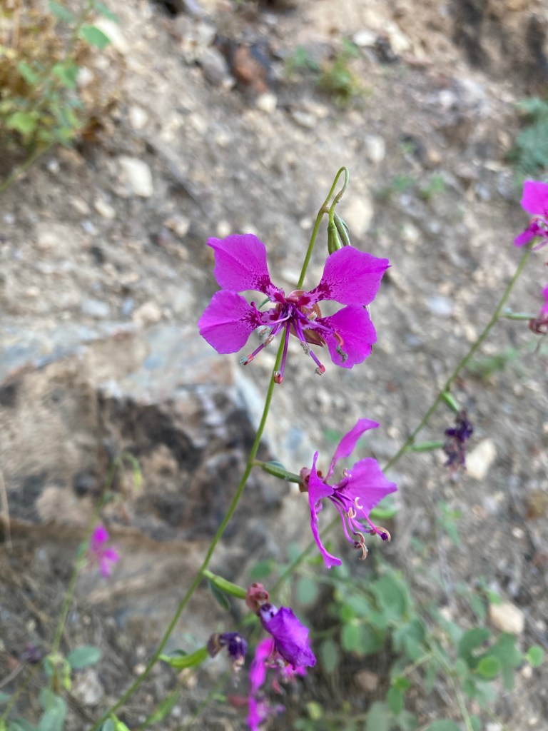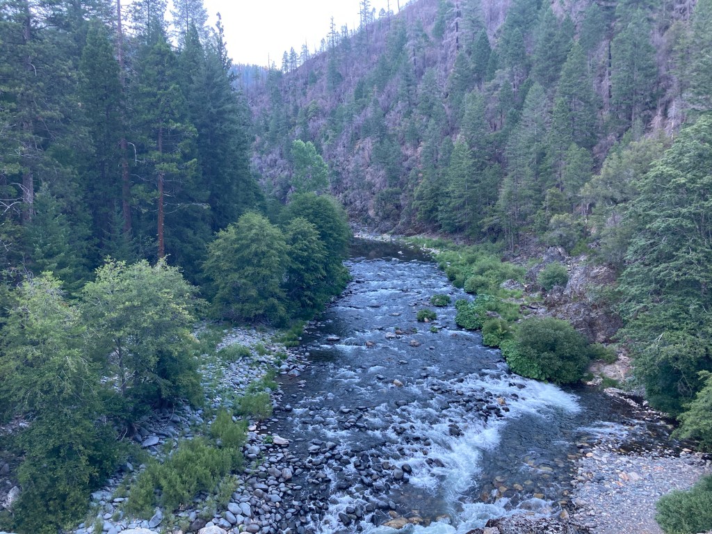 The Guthook comments made me scared of this downhill, but it’s really not bad. It’s a ton of switchbacks all the way down. I can hear the river from a couple of miles away. There are flowers everywhere and the sunset over the hills is so lovely. Soon I’m just about at the bottom, and the Middle Fork of the Feather River is roaring through the canyon. It’s astonishing. I follow the trail over a bridge perched high above the water. I can feel the wood and steel shaking gently and hear the current gushing below. I take a minute to breathe in this place. Can this trail get any more amazing?